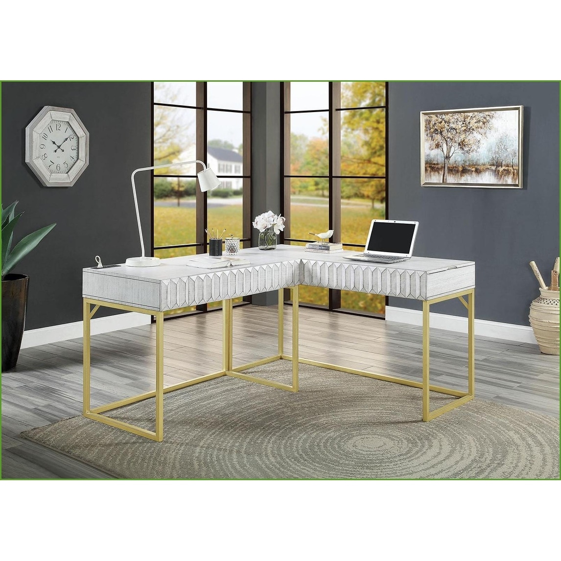 Desks, Transitional Two-Tone Lift-Top Computer Desk with USB Port and Concealed Drawer, Antique White, Solid Wood,Steel