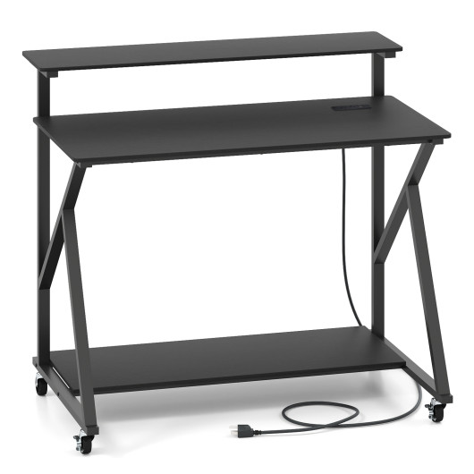 Costway Rolling Computer Desk with Charging Station and Monitor Shelf Storage for Home Office-Black