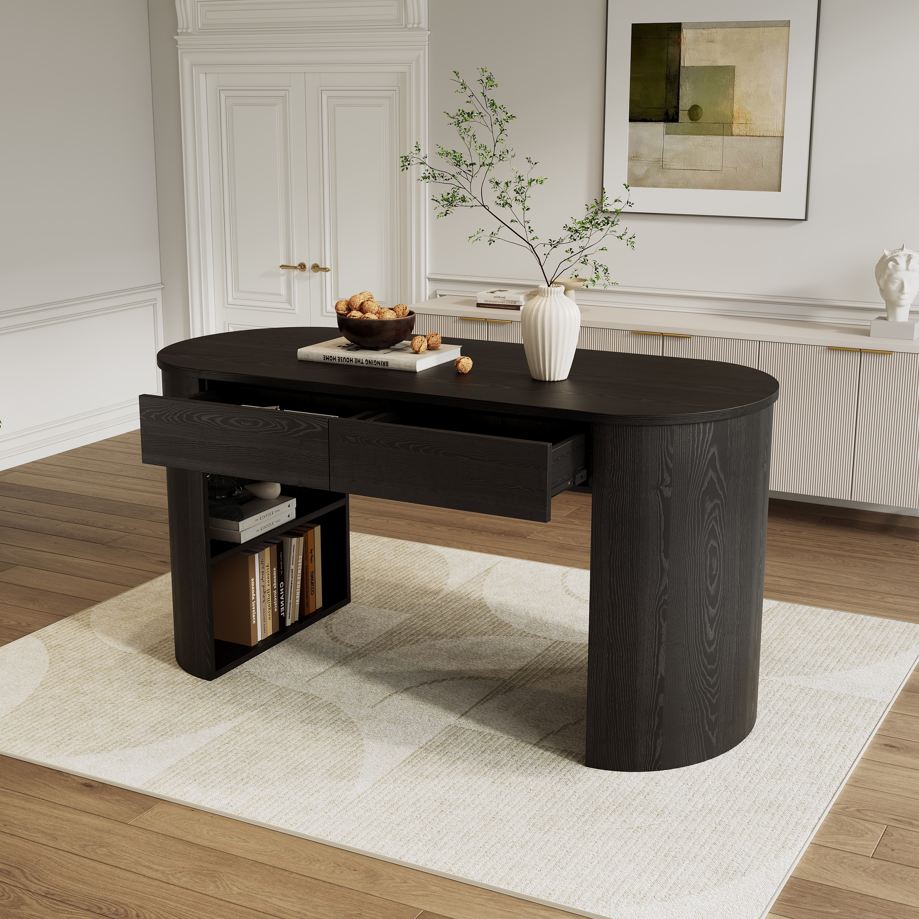 Modern Writing Desk with Storage Drawers, Home Office Desk with Open Shelves, Computer Desk with Half-Cylinder Base