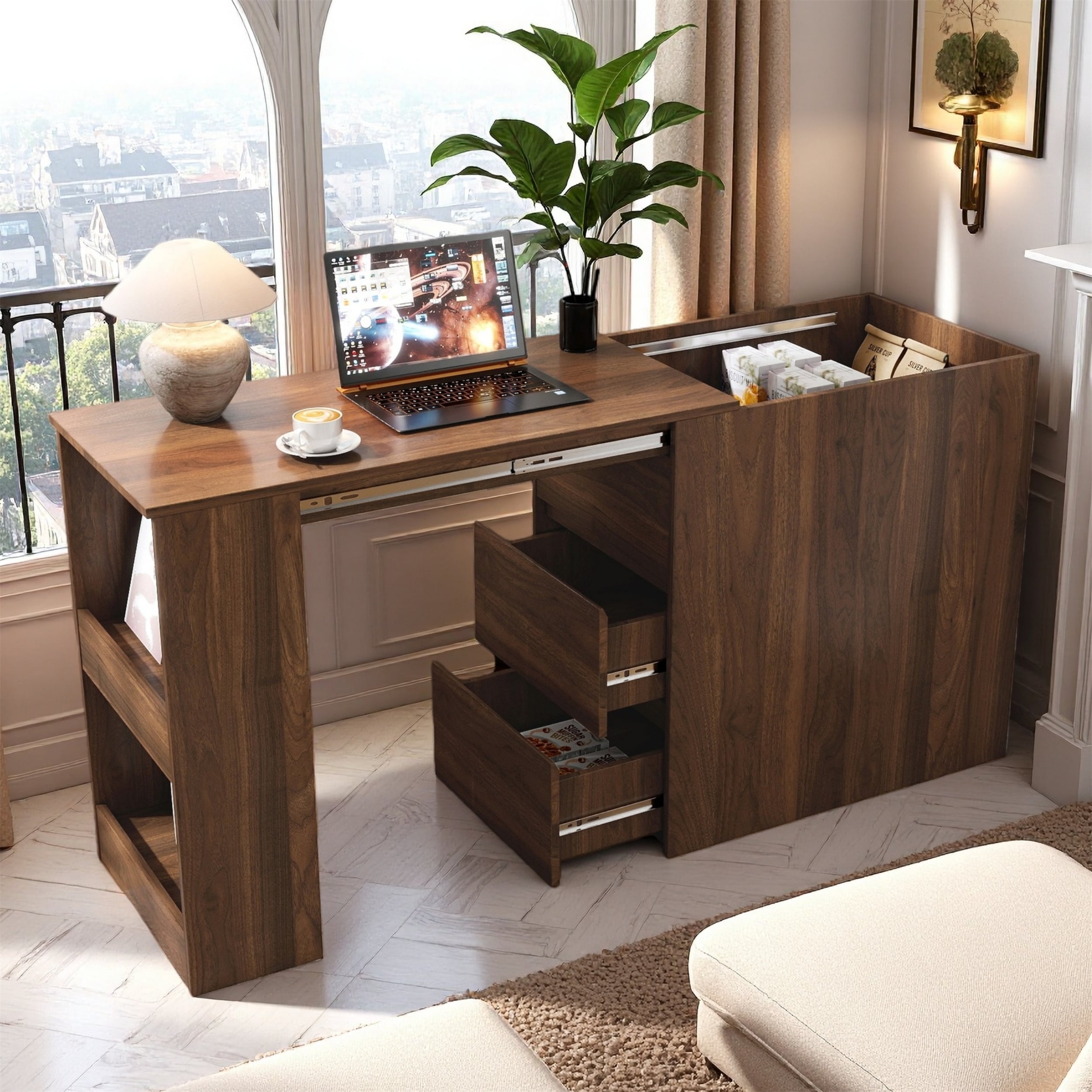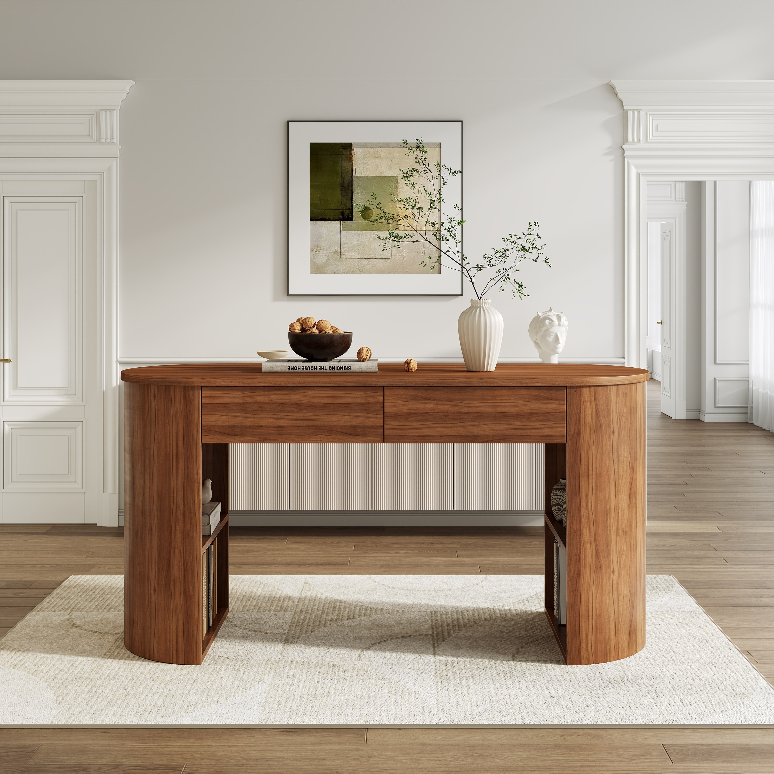 Modern Writing Desk with Storage Drawers, Home Office Desk with Open Shelves, Computer Desk with Half-Cylinder Base