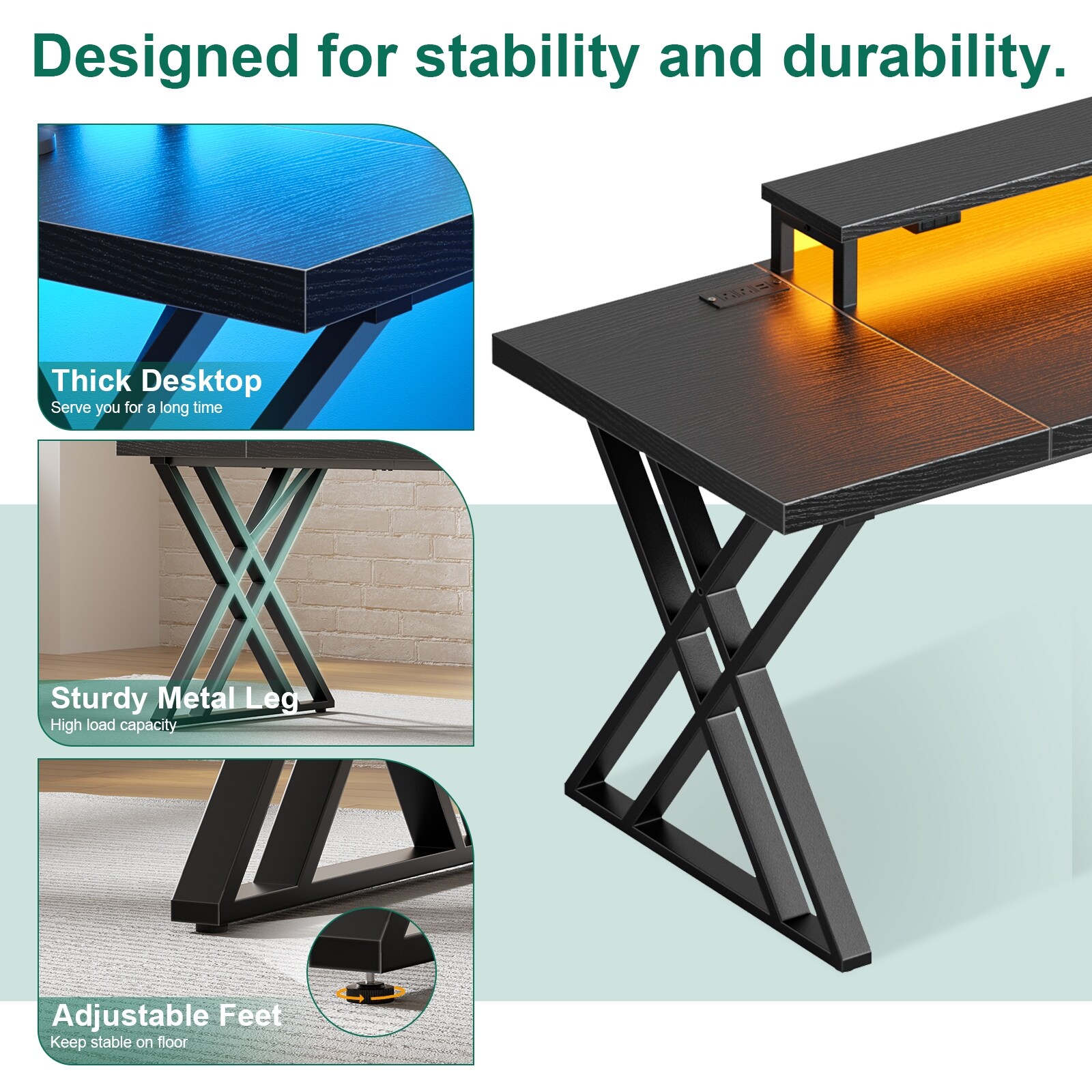 55 Inch L-shaped Gaming Desk with Power Outlets and LED Lights Computer Corner Desk with File Cabinet Monitor Stand