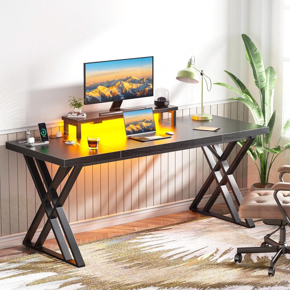 Gaming Desk with USB Charging, LED Light, Monitor Riser X-Frame