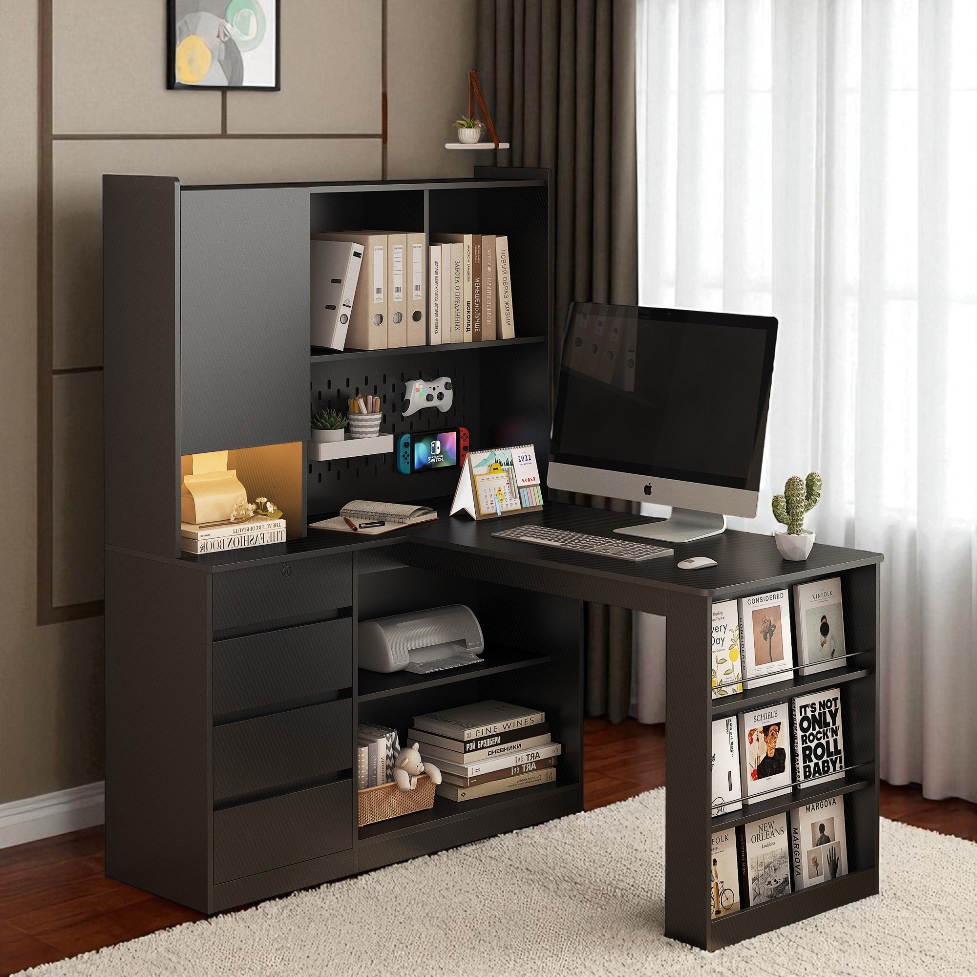 L-Shaped Desk with Charger, LED Light, Computer Desk with Drawers & Bookshelf, Modern Corner Desk for Home Office, Gaming