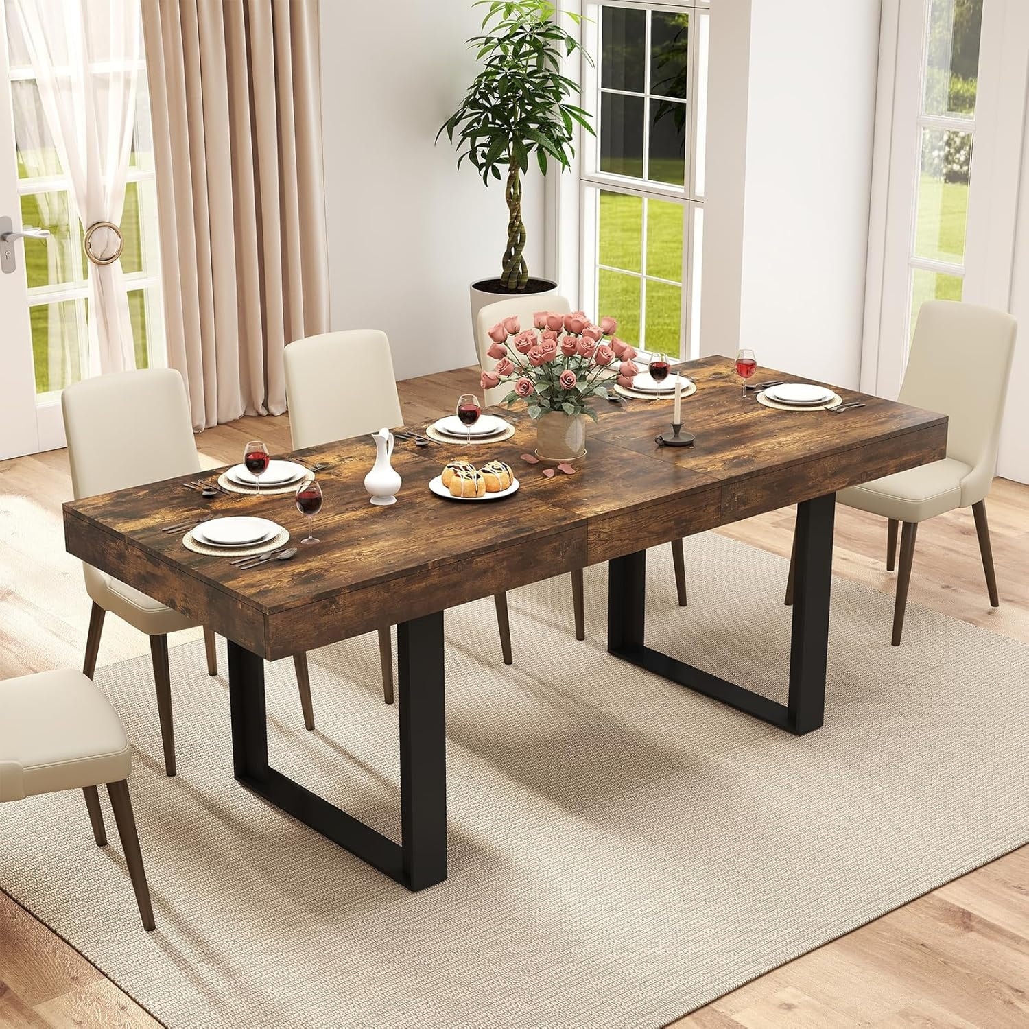 78" Farmhouse Dining Table with Storage Base - Rectangular MDF Table for 6, Rustic Modern