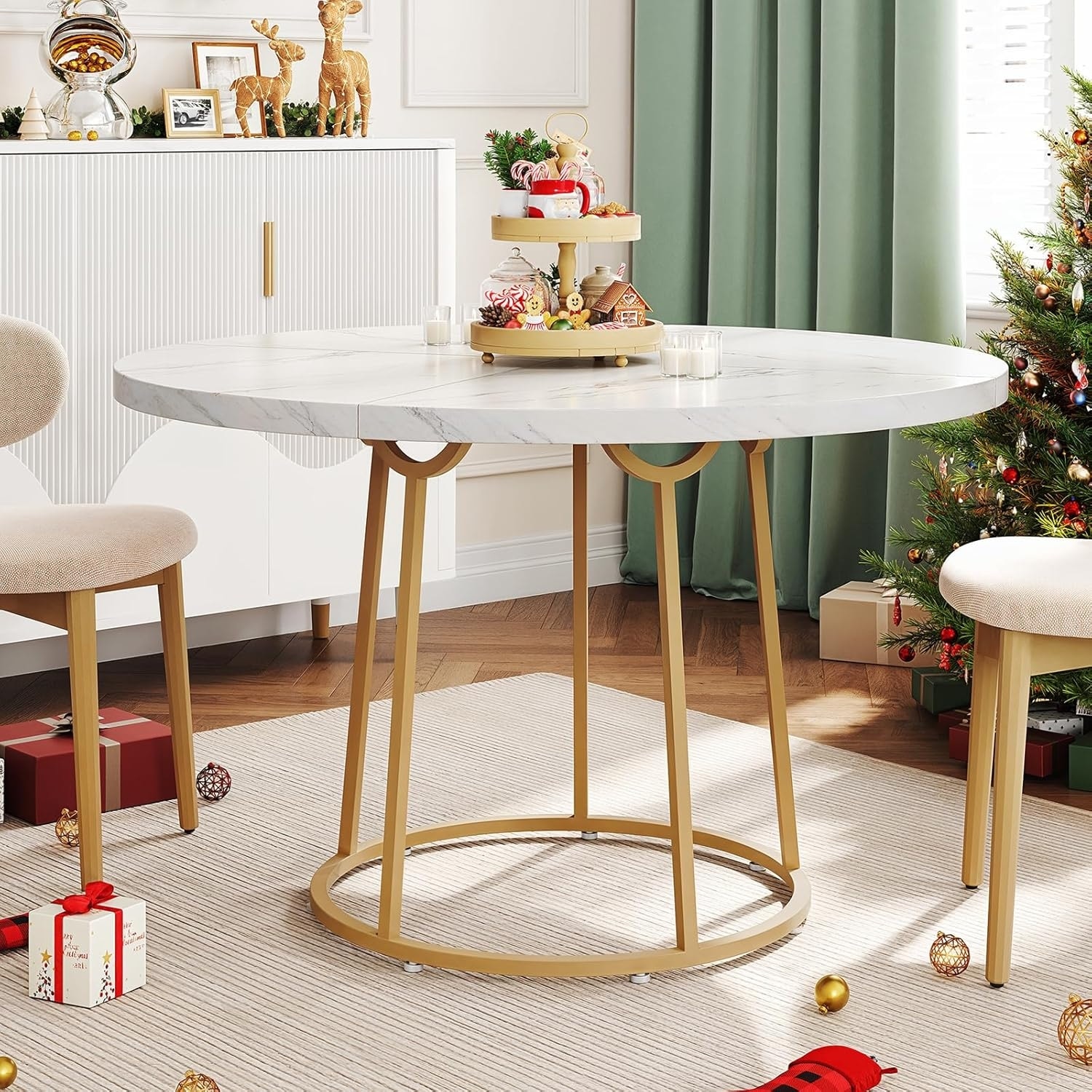 47.24 Inch Round Dining Table with Wooden Faux Marble Top and Gold Metal Base, Modern Design for Home, Kitchen, or Restaurant
