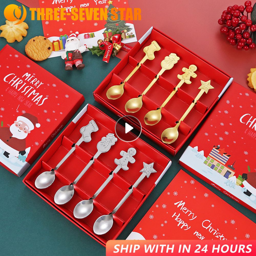 Christmas Gift Glod Spoon Fork Set Elk Christmas Tree Decoration, Dessert Scoop, Fruit Fork, Coffee Spoon Cutlery Set 4PCS Gold SpoonA