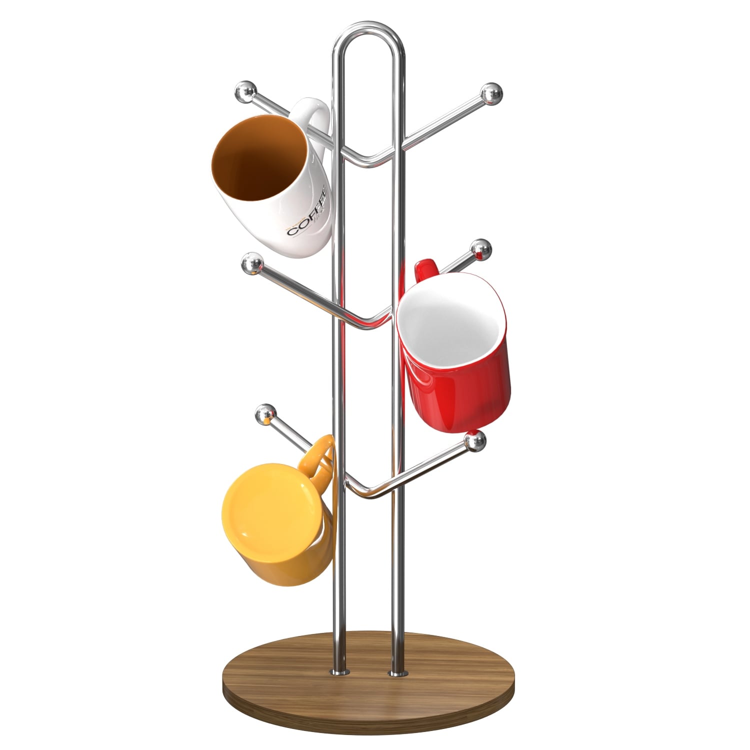 Mug Holder with Wood Base and 6 Hooks, Kitchen Coffee Mug Tree Countertop Tea Cups Holder Stand, Coffee Cup Dryer