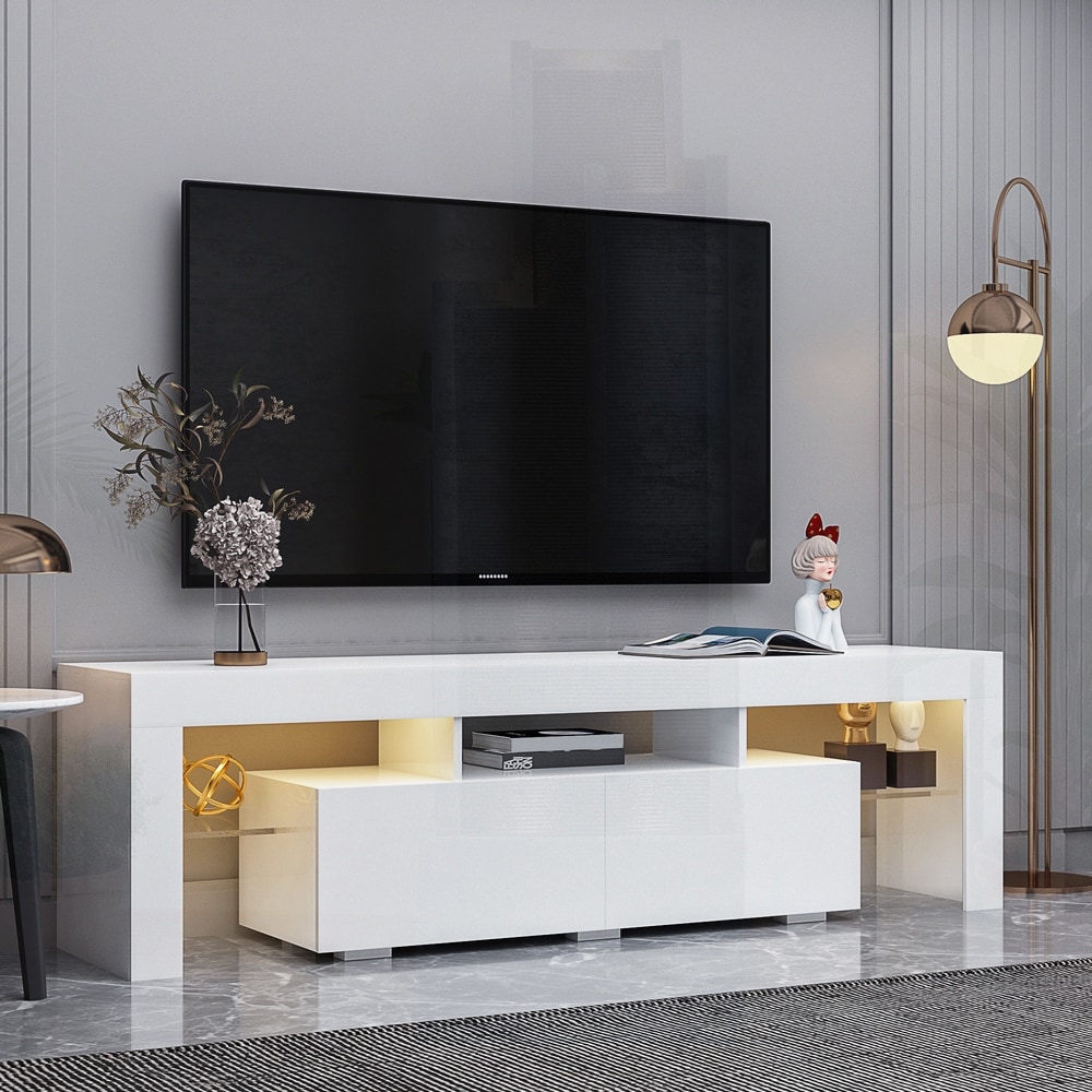 GDF Studio - Modern White Particle Board TV Stand with LED Light Belt and Glass Shelf