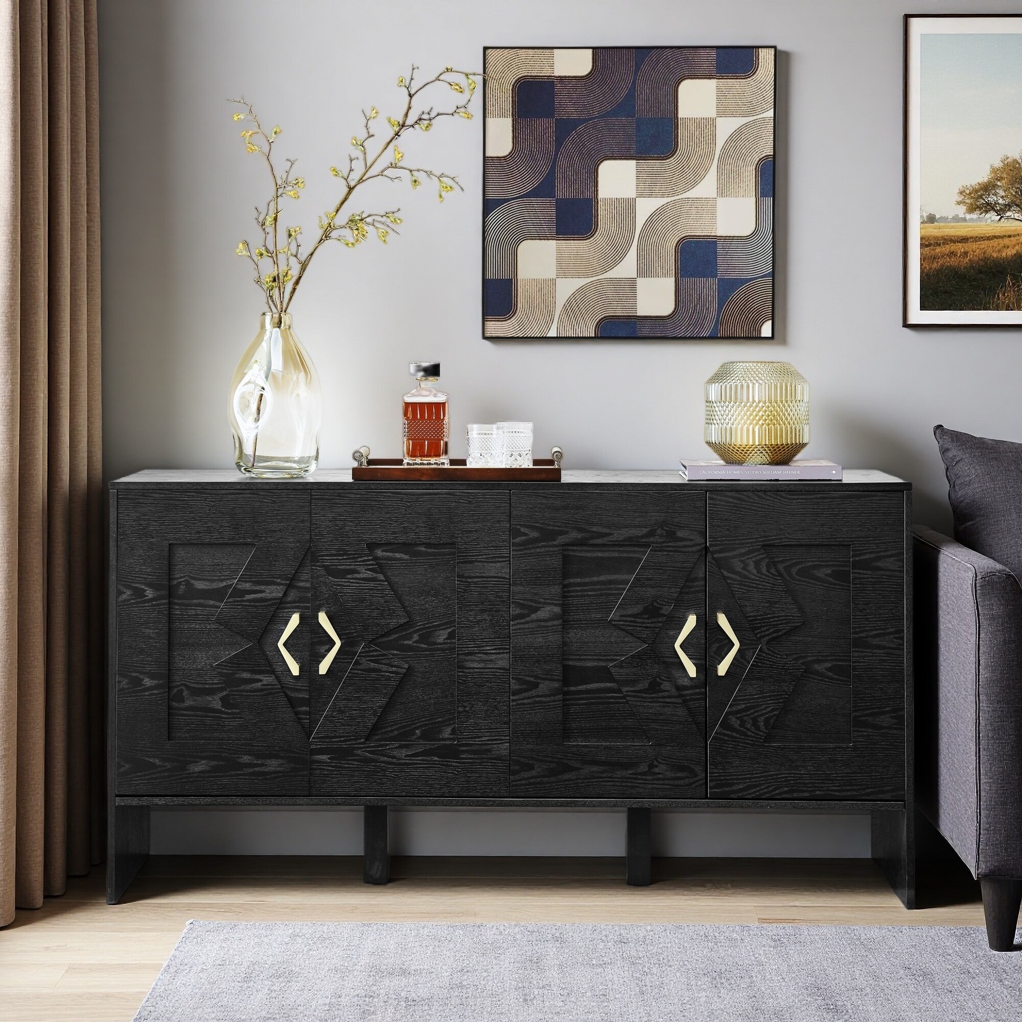 60" Mid Century Modern Sideboard Buffet with Geometric Pattern, 4 Doors, Adjustable Shelves, Outlet Holes, Storage Cabinet