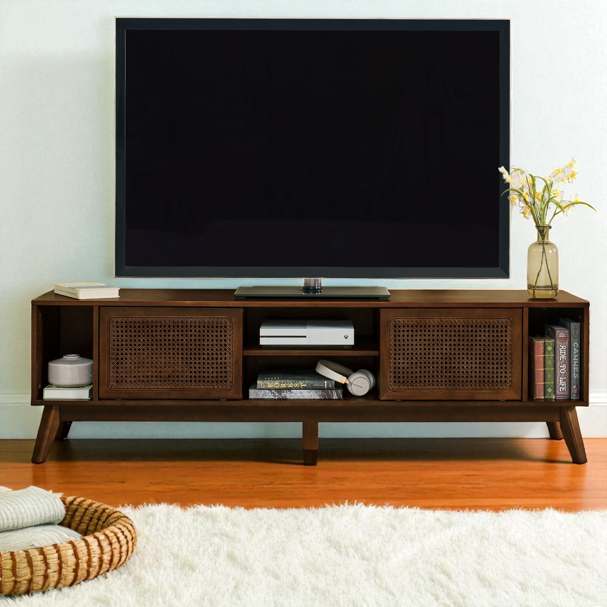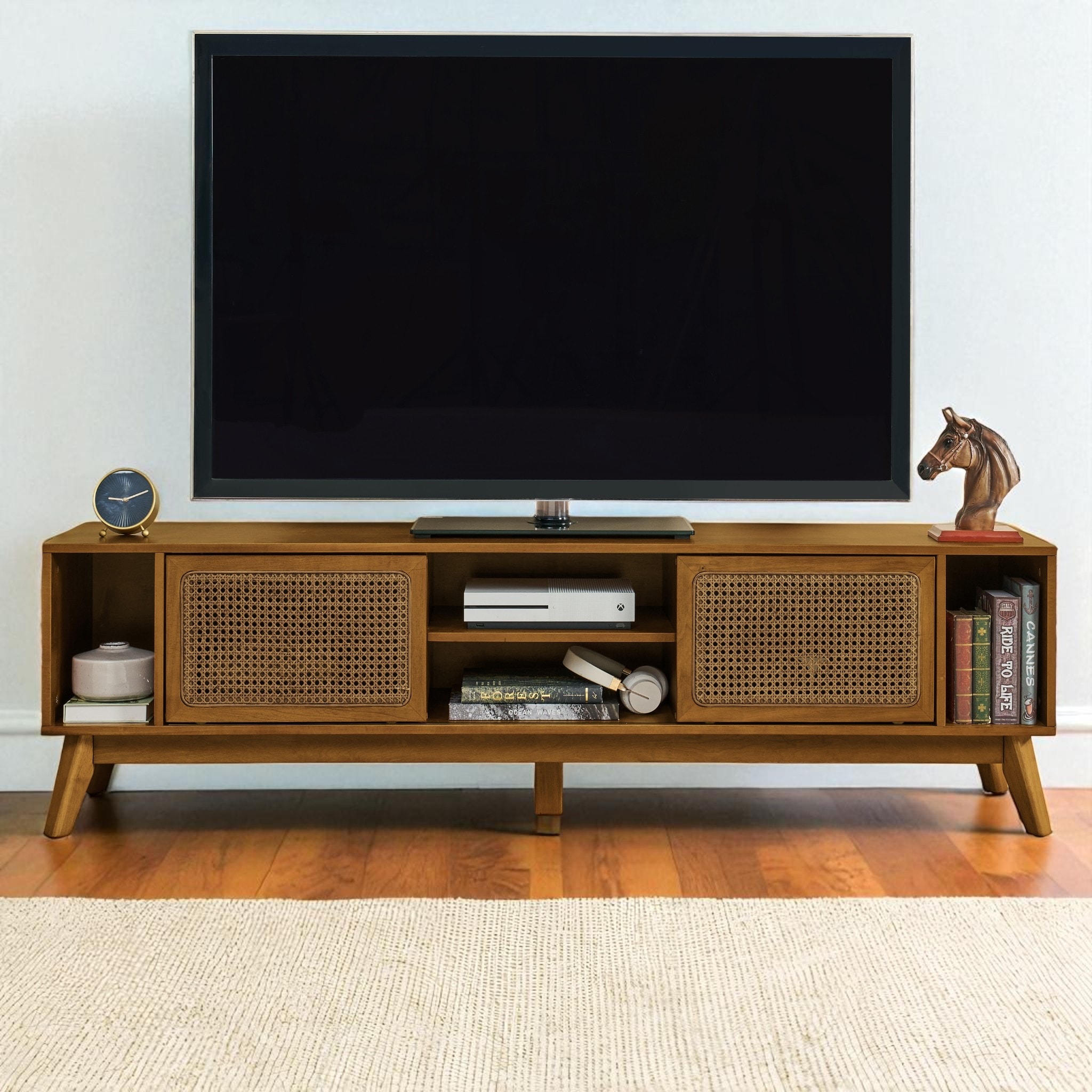 67.9'' Modern Rattan TV Stand for TVs up to 75", Entertainment Console with Sliding Doors, Open Shelves & Solid Wood Legs