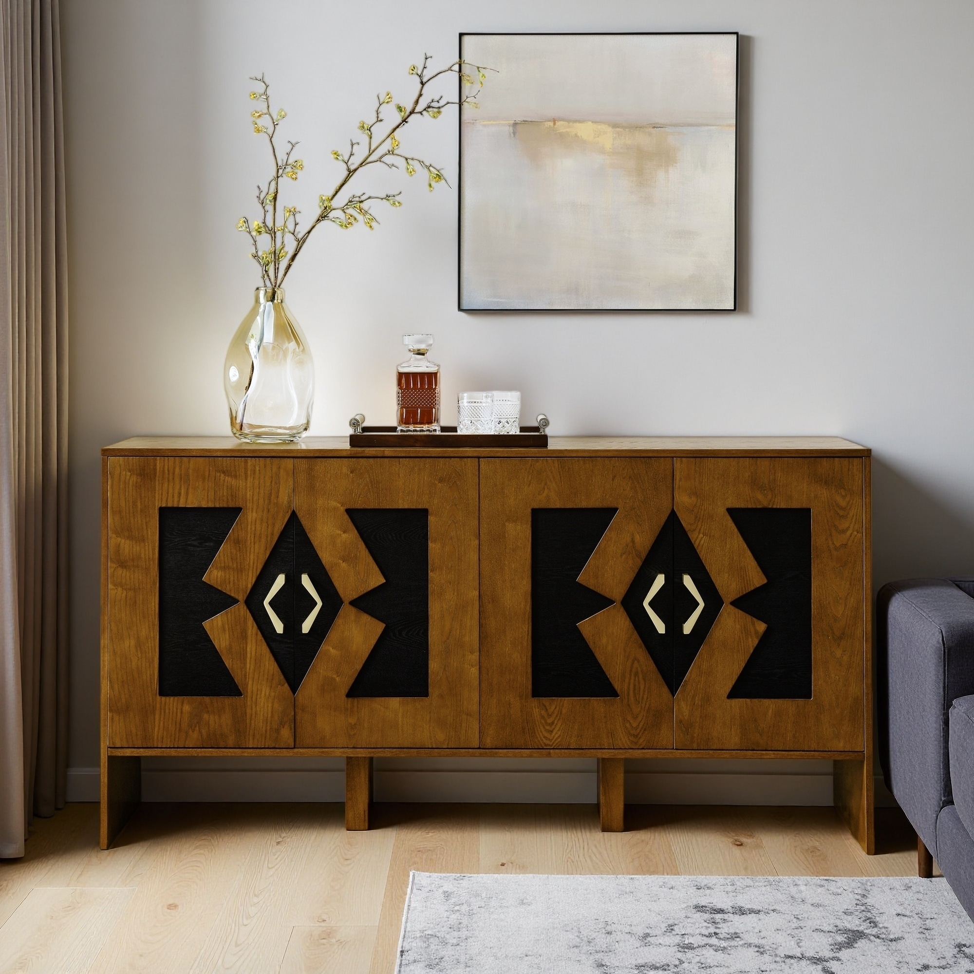 60" Mid Century Modern Sideboard Buffet with Geometric Pattern, 4 Doors, Adjustable Shelves, Outlet Holes, Storage Cabinet