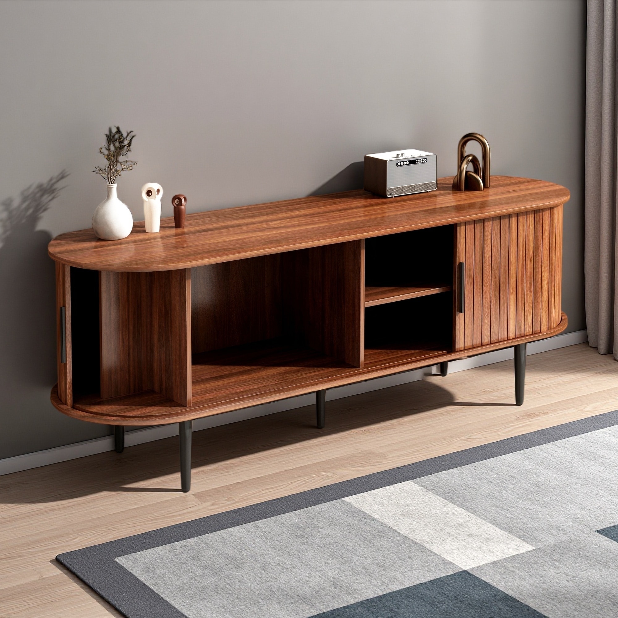 Modern TV Stand with Sliding Door, Storage Cabinets & Fluted Design