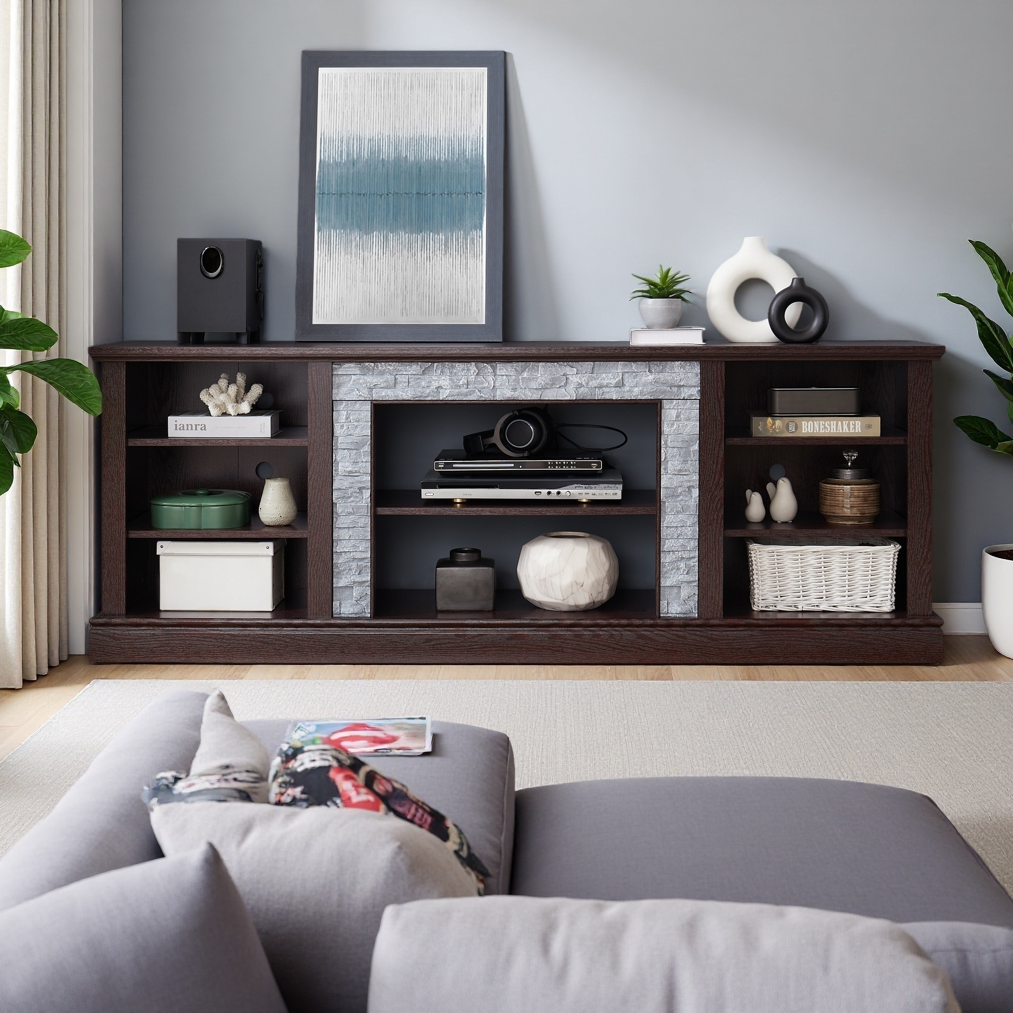 70" Large Modern TV Stand with Faux Stacked Stone Surround, Media Console Table with Spacious Storage Cabinet