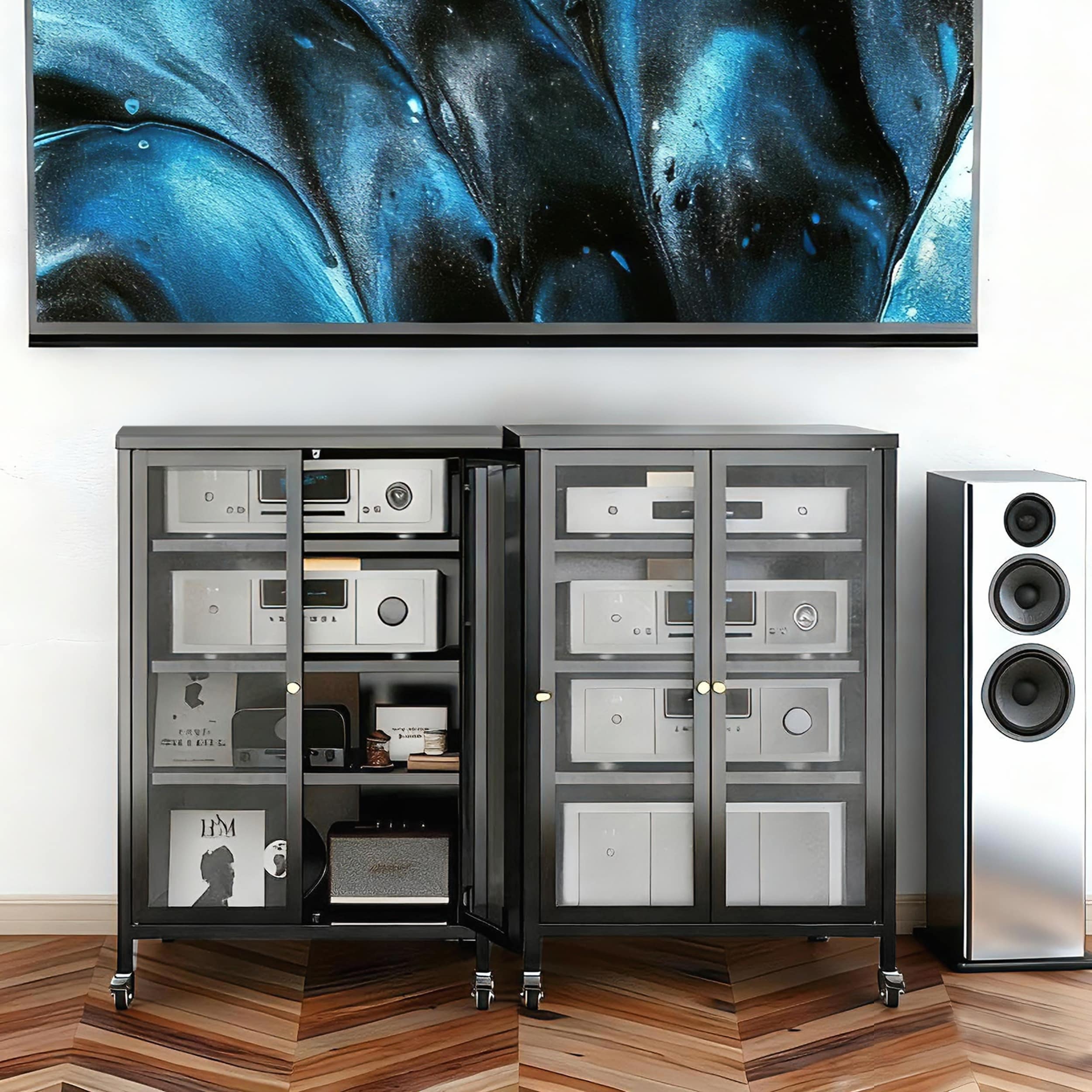 Media Storage Cabinet with Wheels and Heavy-Duty Steel Frame for Living Room
