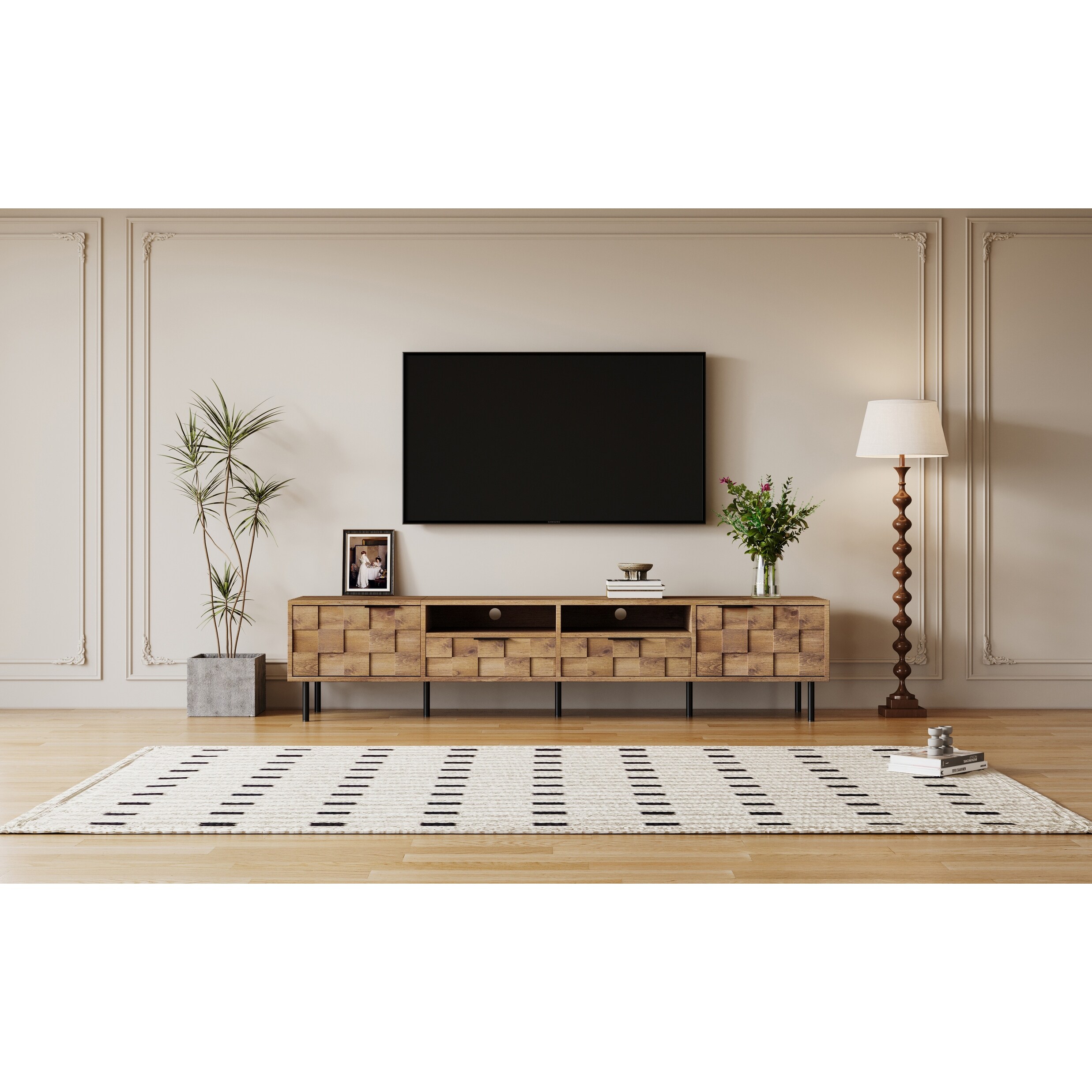 Wavy Door TV Cabinet with Adjustable Shelves, TV Stand with Cylindrical Legs and Cable Holes for TVs Up to 75"