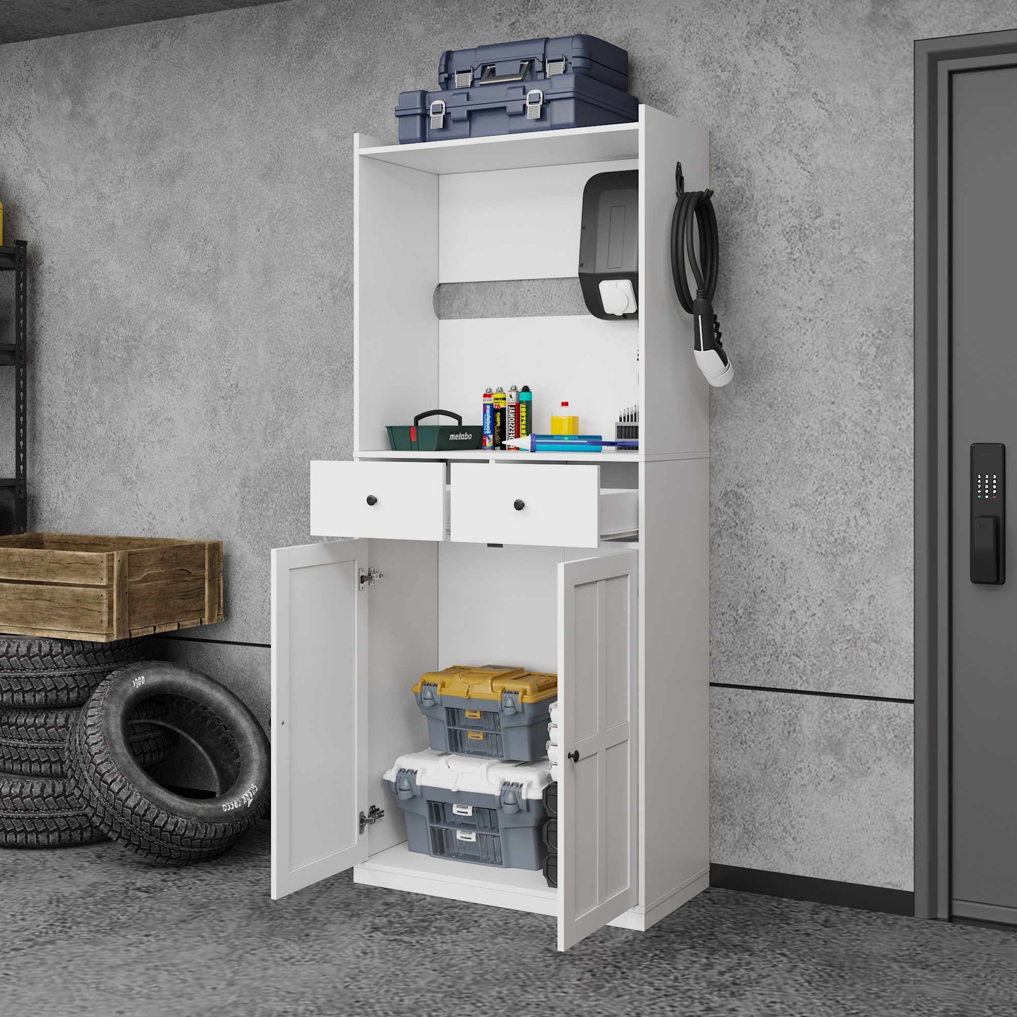 74" Garage Storage Cabinet with EV Charger Stand, Freestanding Charging Station Organizer with Hooks, 2 Drawers & 2 Doors