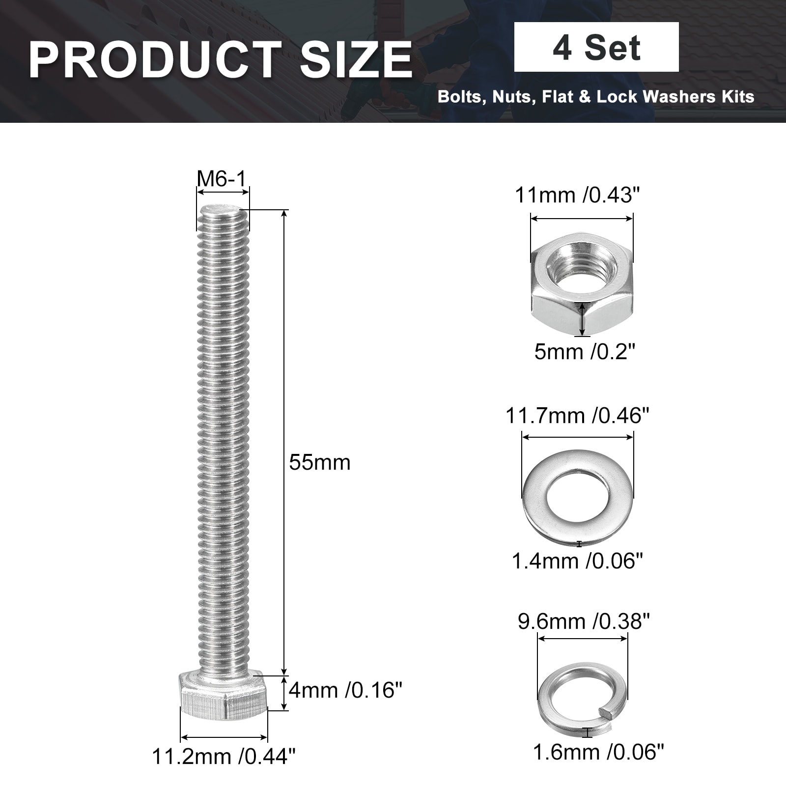 Hex Head Screws Bolts, Nuts, Flat Lock Washers Kits, Stainless Steel Fully Thread Hexagon Bolts