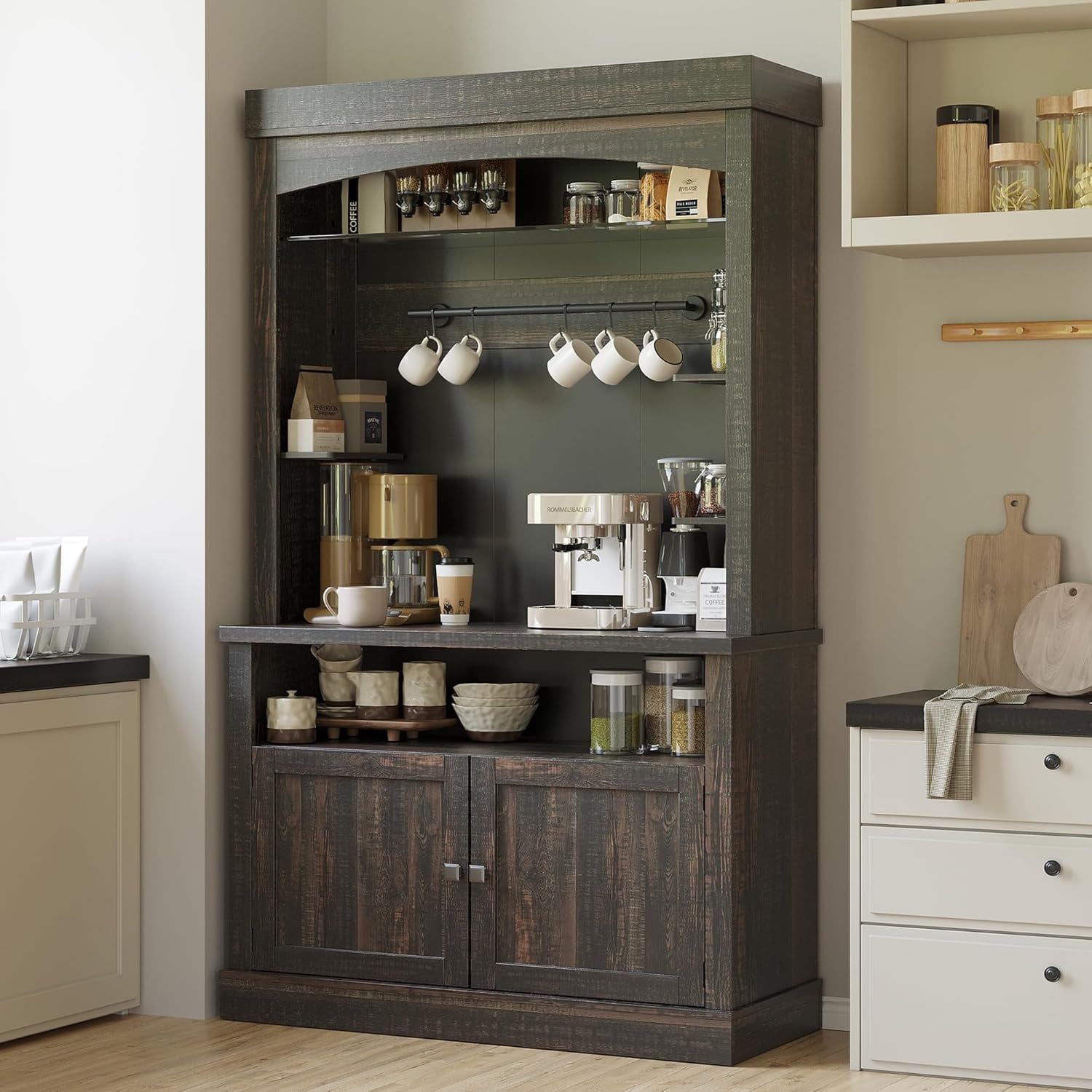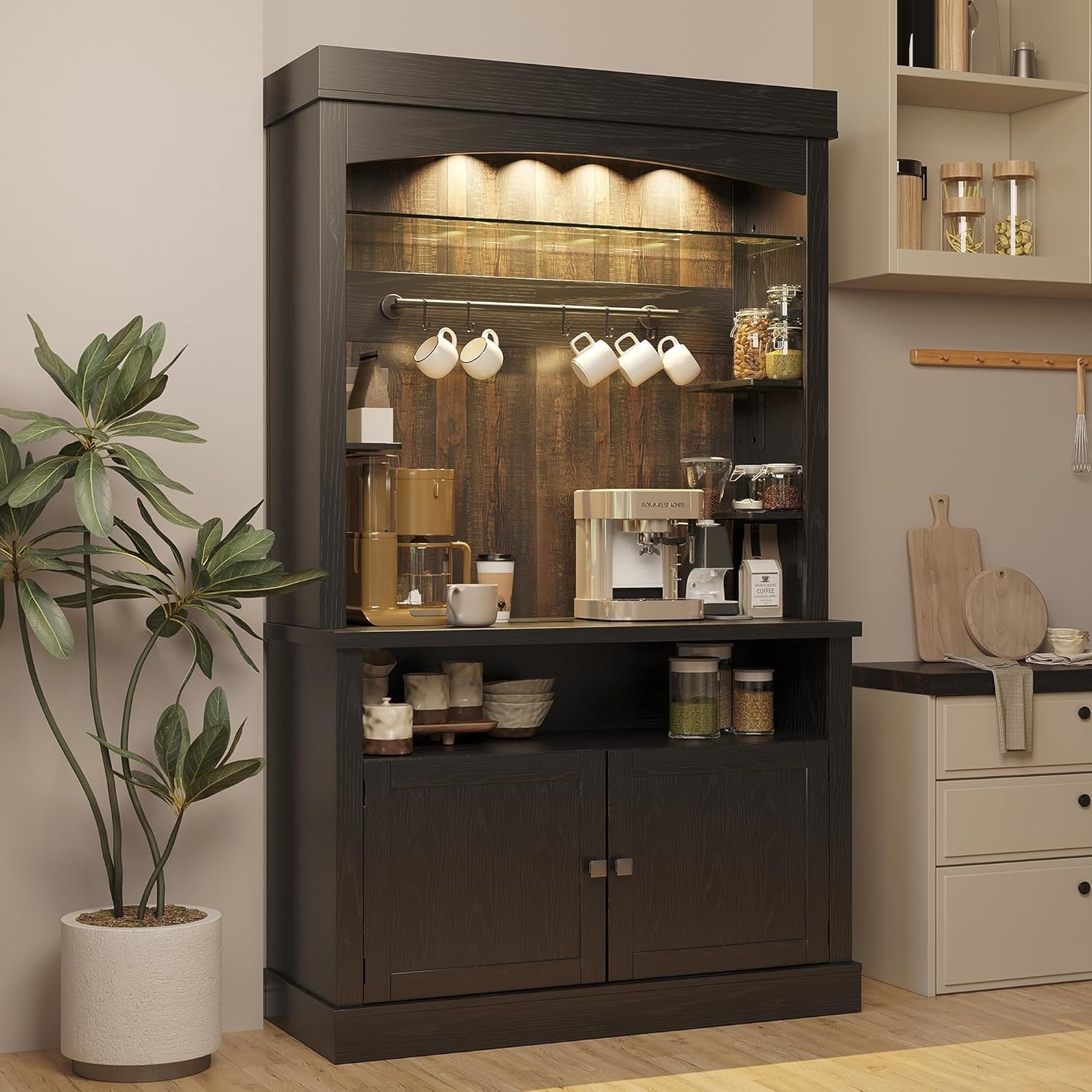 Tall Coffee Hutch Coffee 72" Tall Bar Cabinet with LED Lights Farmhouse Buffet Cabinet