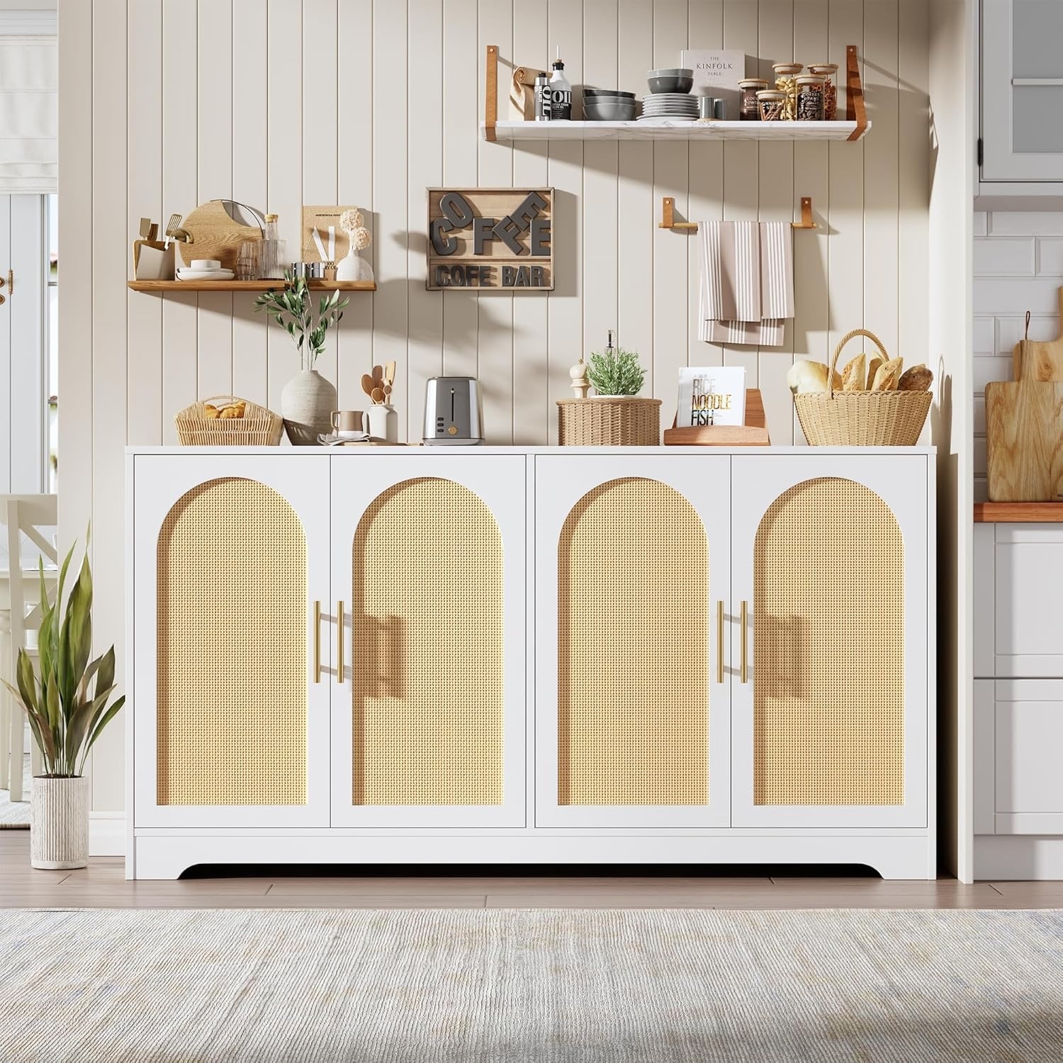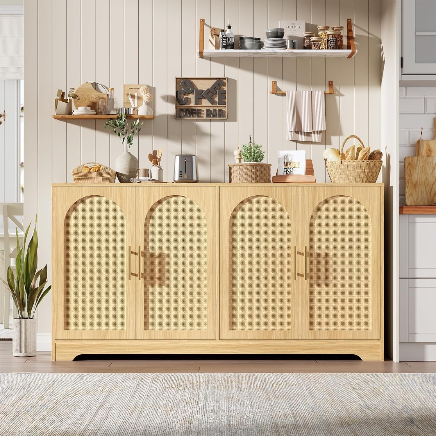 Sideboard Buffet Cabinet with Storage, Rattan Kitchen Buffet Accent Sideboard with Drawer and Adjustable Shelves
