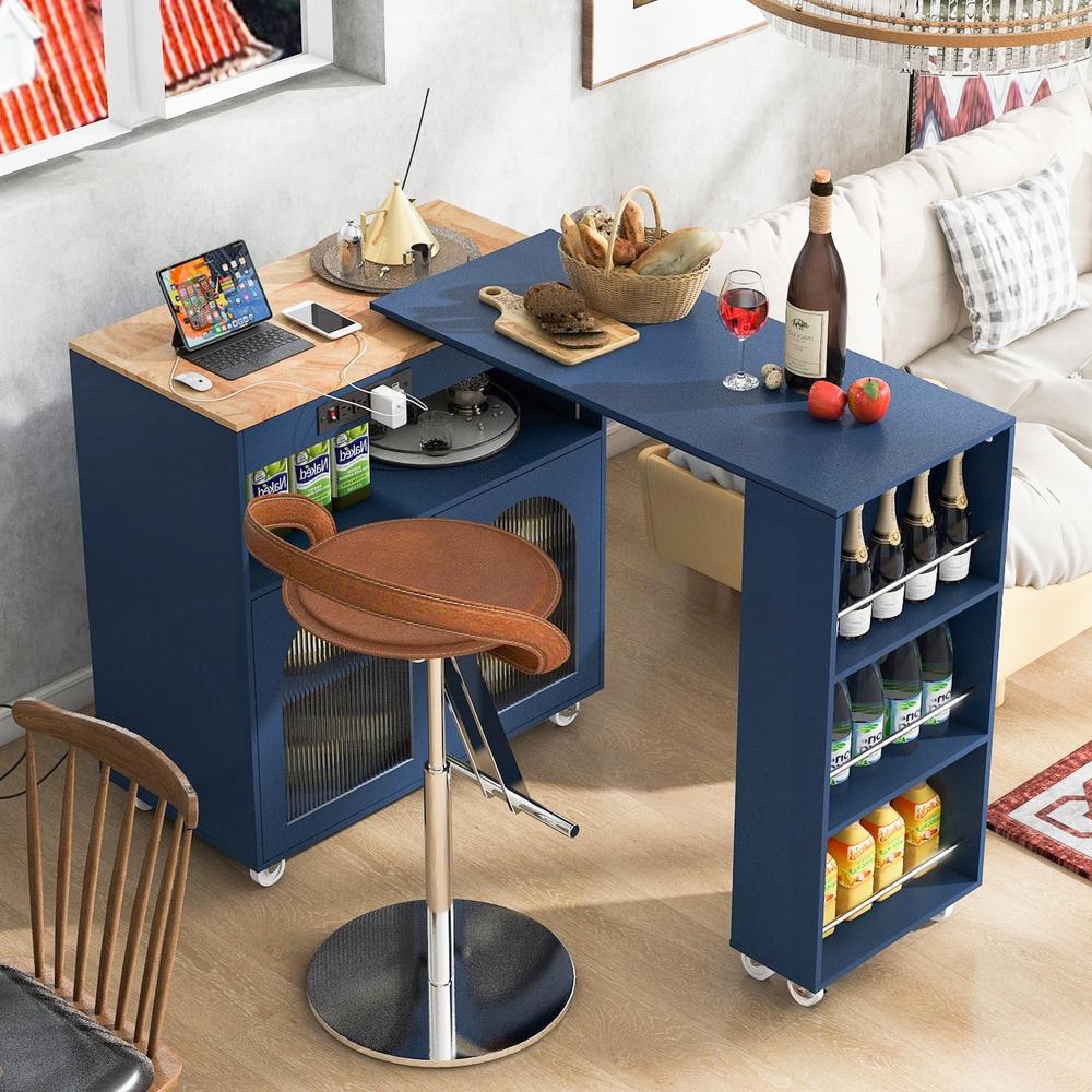 Rolling Kitchen Island with LED, Extended Table and Storage Navy