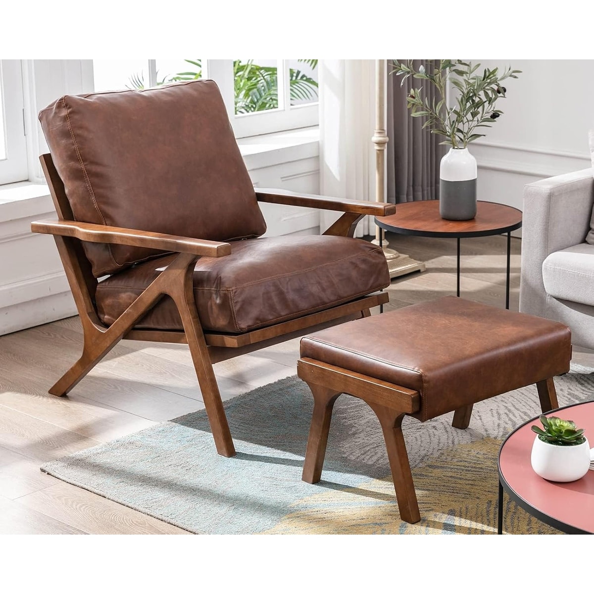 Mid Century Modern Accent Chair with Ottoman, PU Upholstered Armchair Set with Wood Frame
