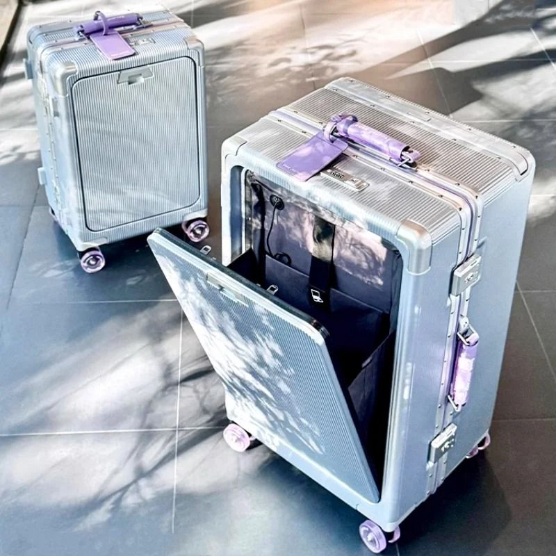 Front Opening Pocket Rolling Luggage With Aluminum Frame Wide Handle Silent Wheels USB Charging And TSA Lock 24inches 600mm white Purple