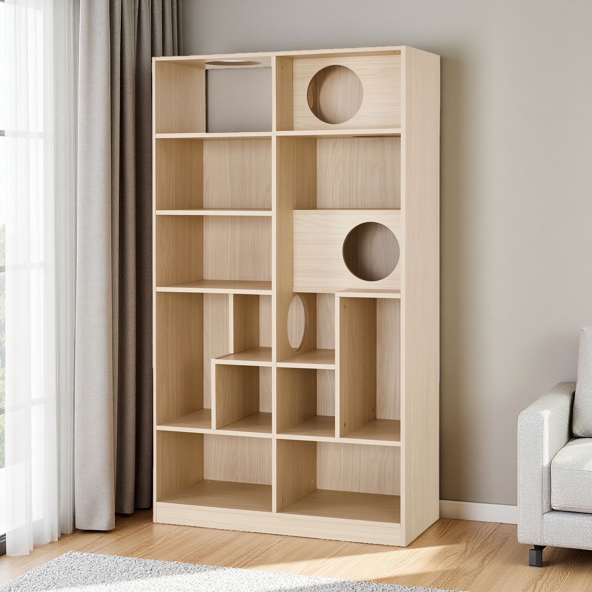 63.5"H Modern 2-in-1 Wood Bookshelf Cat House, Cat Tree Display Case with Storage, Cat Litter Box Enclosure & Climbing Shelf