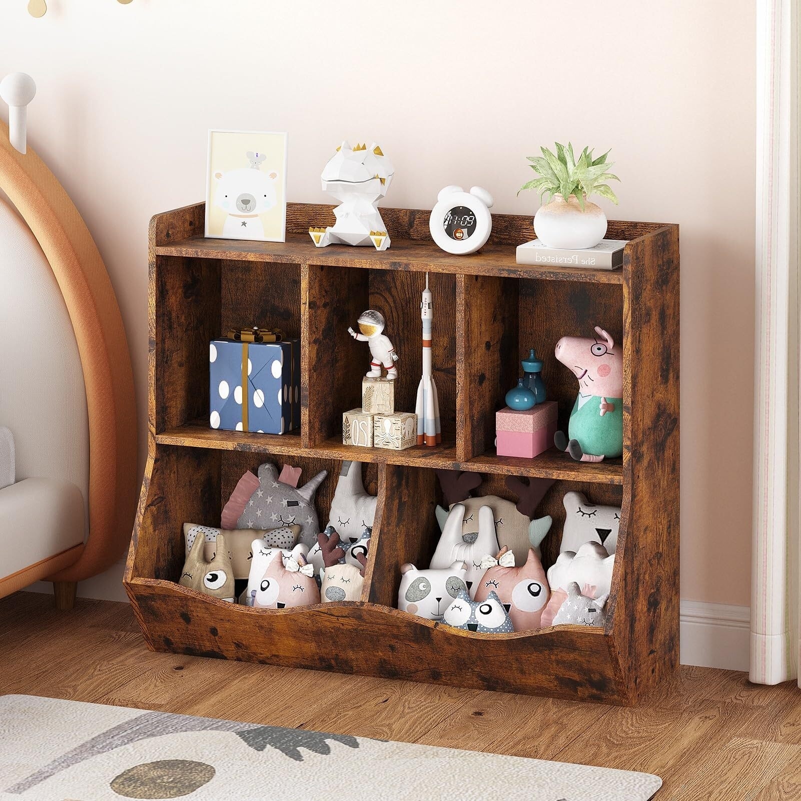 Wooden Kids Bookshelf & Toy Storage, Children Bookcase w/ 5 Compartments