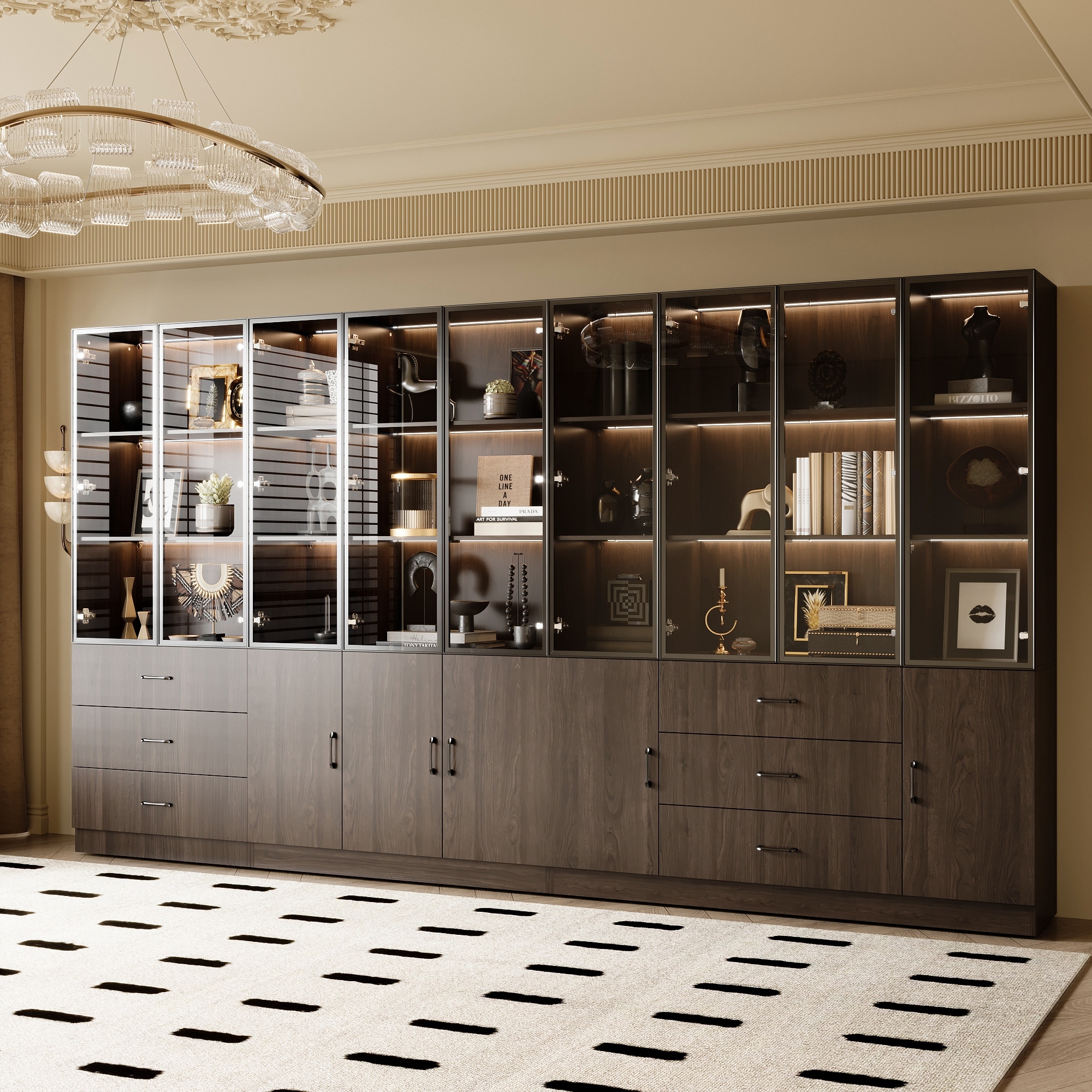 Bookshelves Bookcase Modular Glass Display Cabinet with LED Lights, Dark Wood Storage Combination Cabinet System