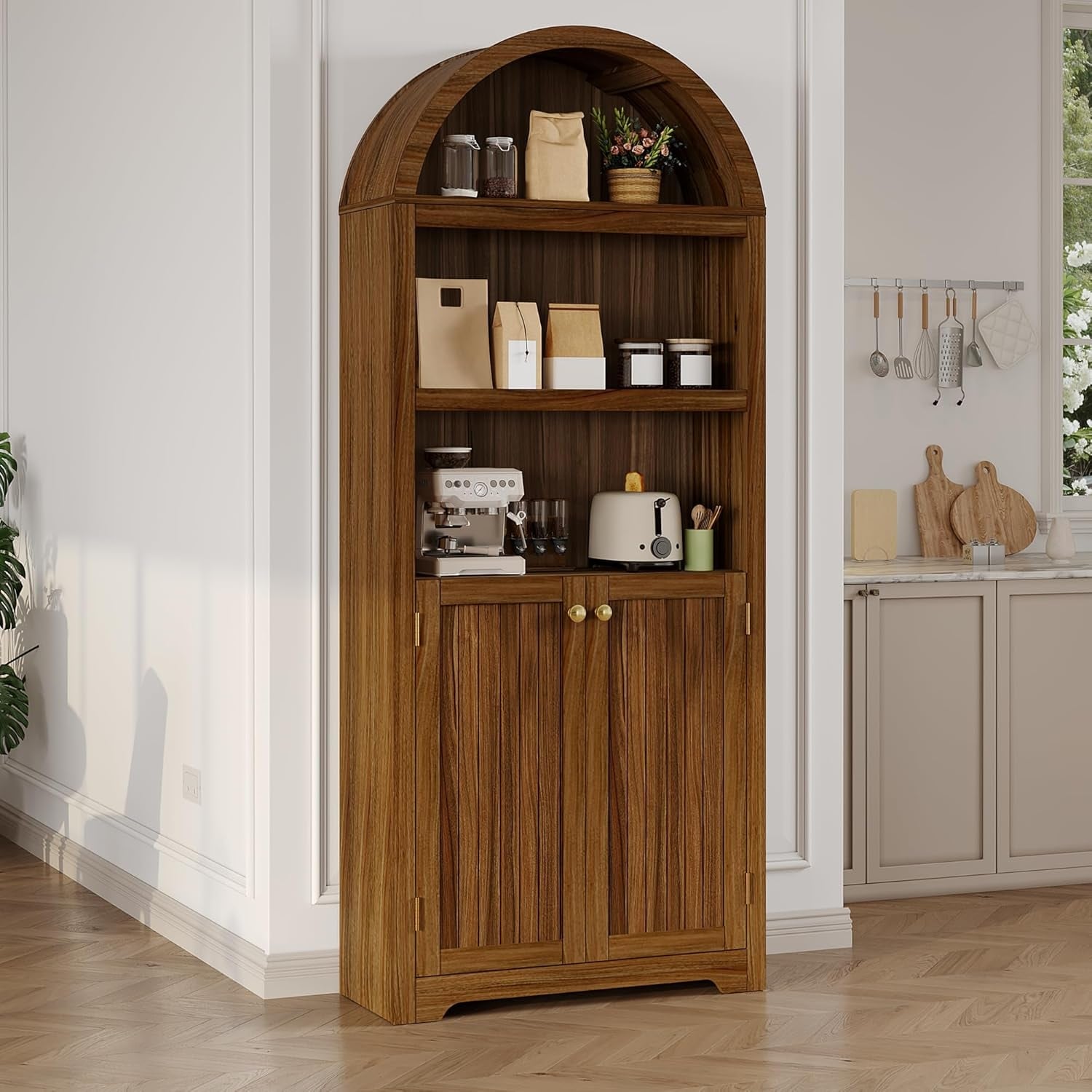 71.7" 5-Tier Arched Bookshelf, Display Cabinet w/ 2 Doors & Shelves