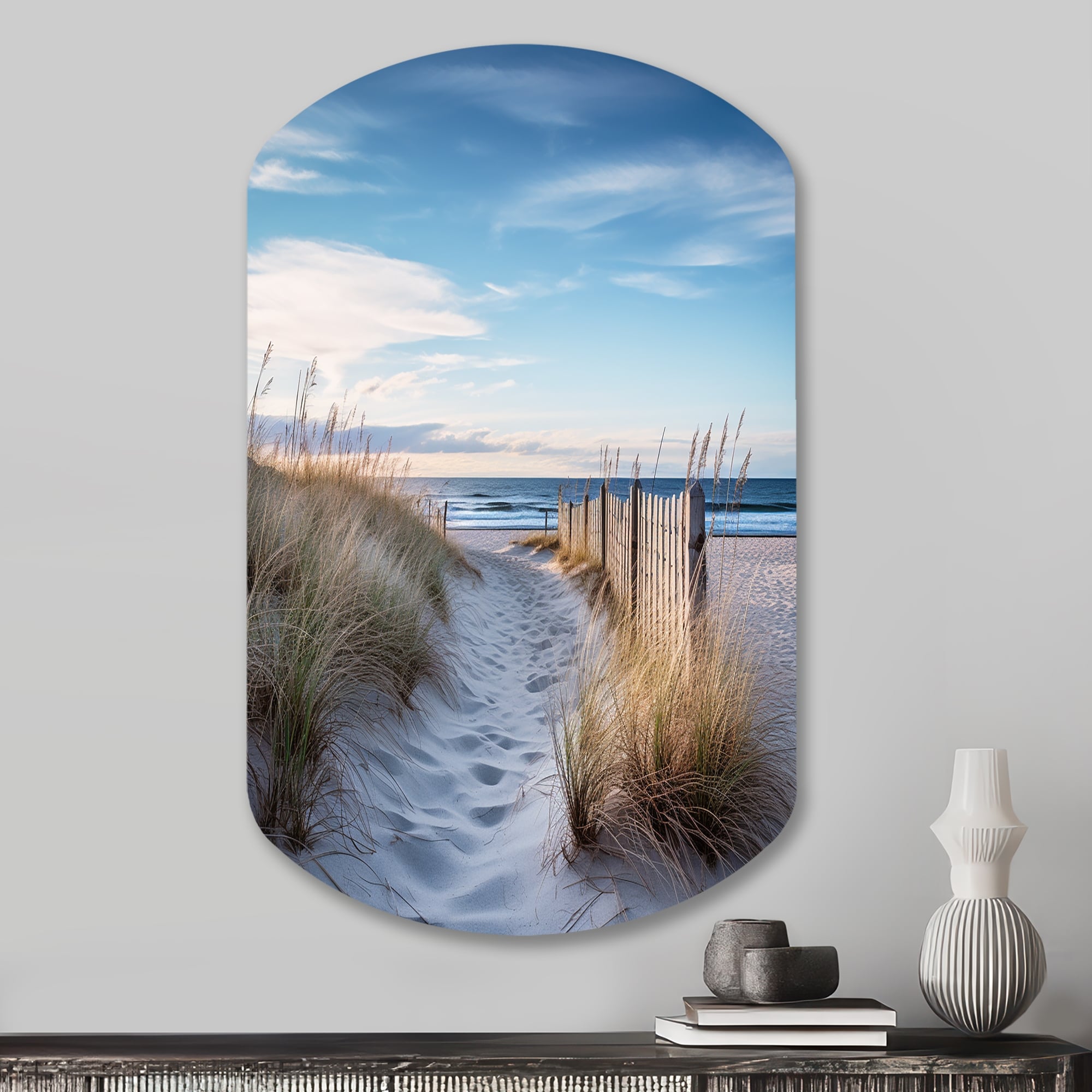 Designart - Path To The Beach II - Coastal Beach Sand Metal Wall Hanging - Nautical & Coastal Metal Cylinder Shape Print