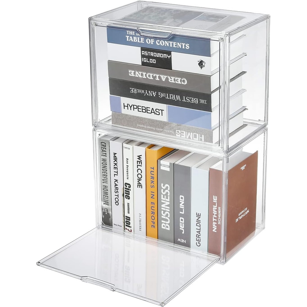 2Pcs Clear Plastic Stackable Book Organizer Box with Magnetic Door for Toys, Books, Shoes