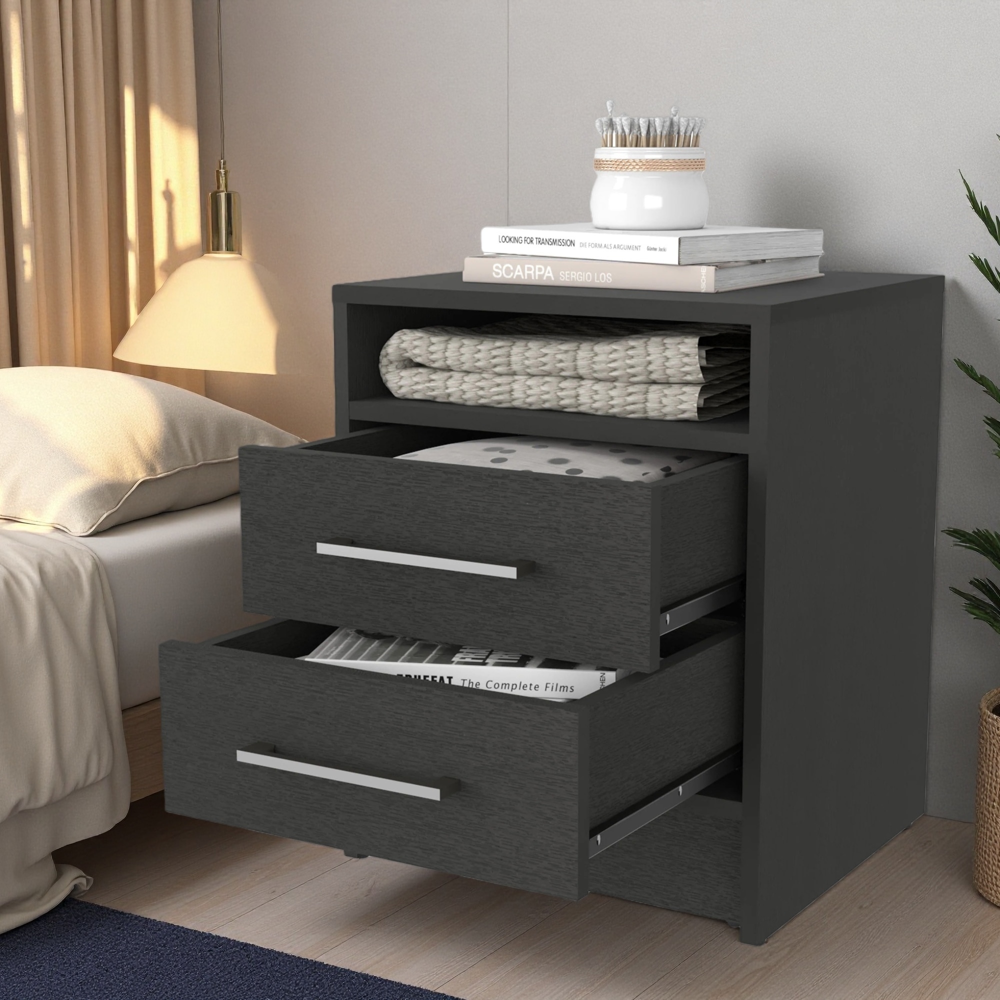 17.7"L Melamine Nightstand with Two Drawers, Open Shelf, and Smooth-Glide Rails - Compact Elegant Bedroom Storage