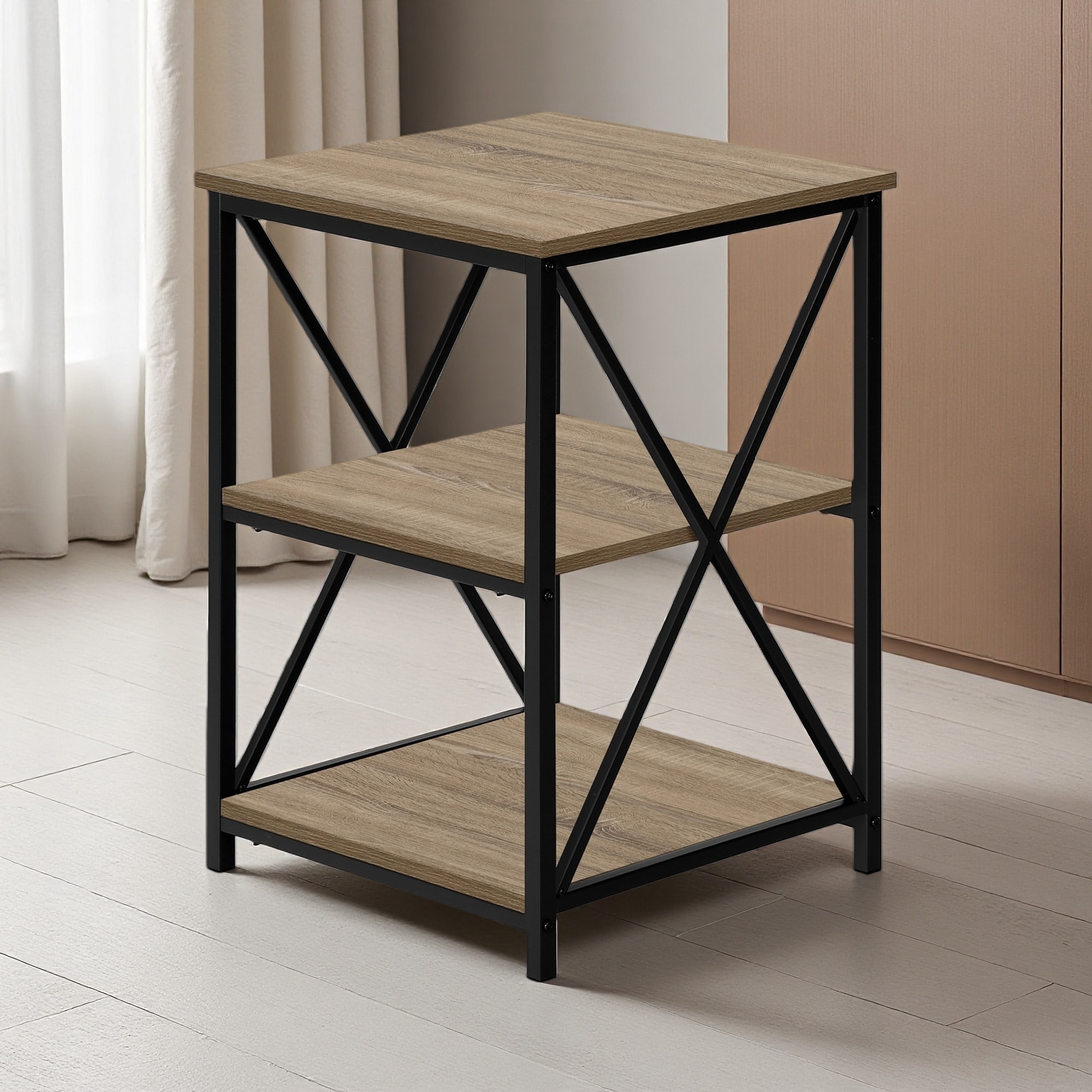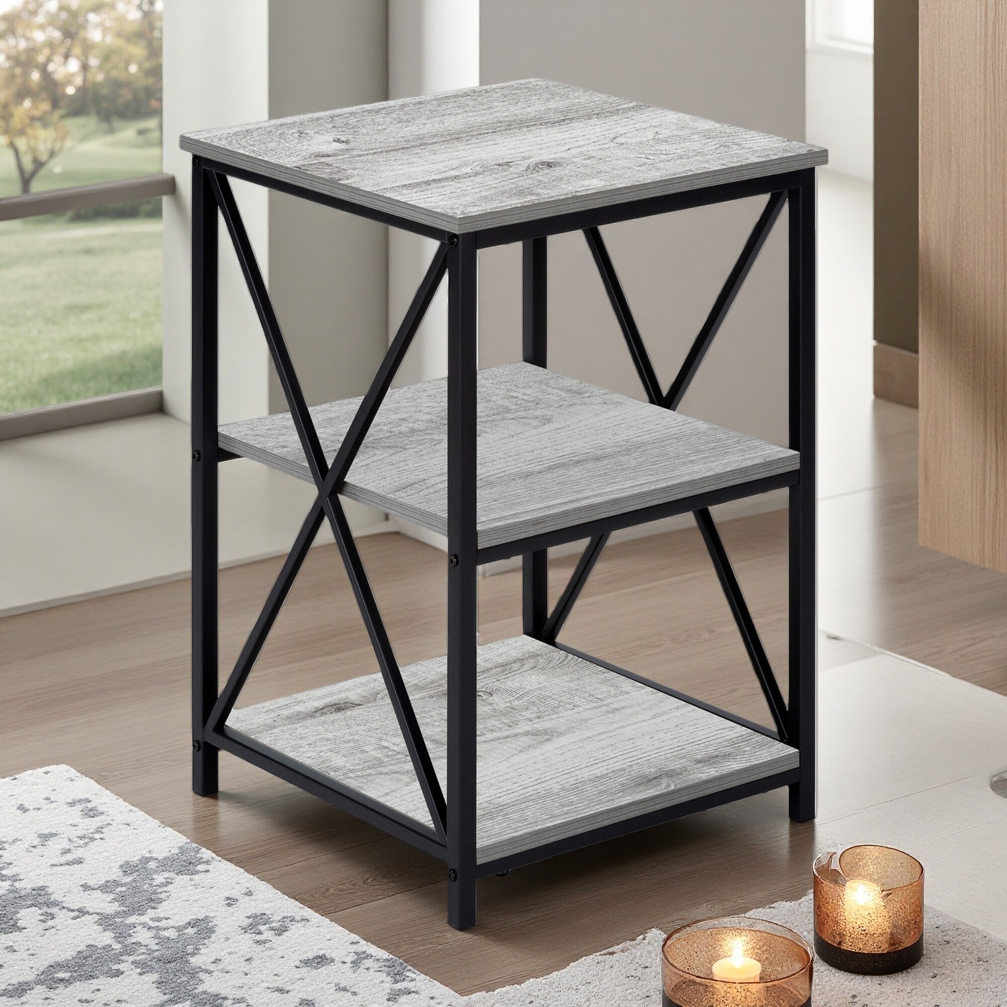 18"L Square 3-Tier Accent Table with X-Shaped Decorative Base, Contemporary Modern Nightstand Table with Storage for Bedroom