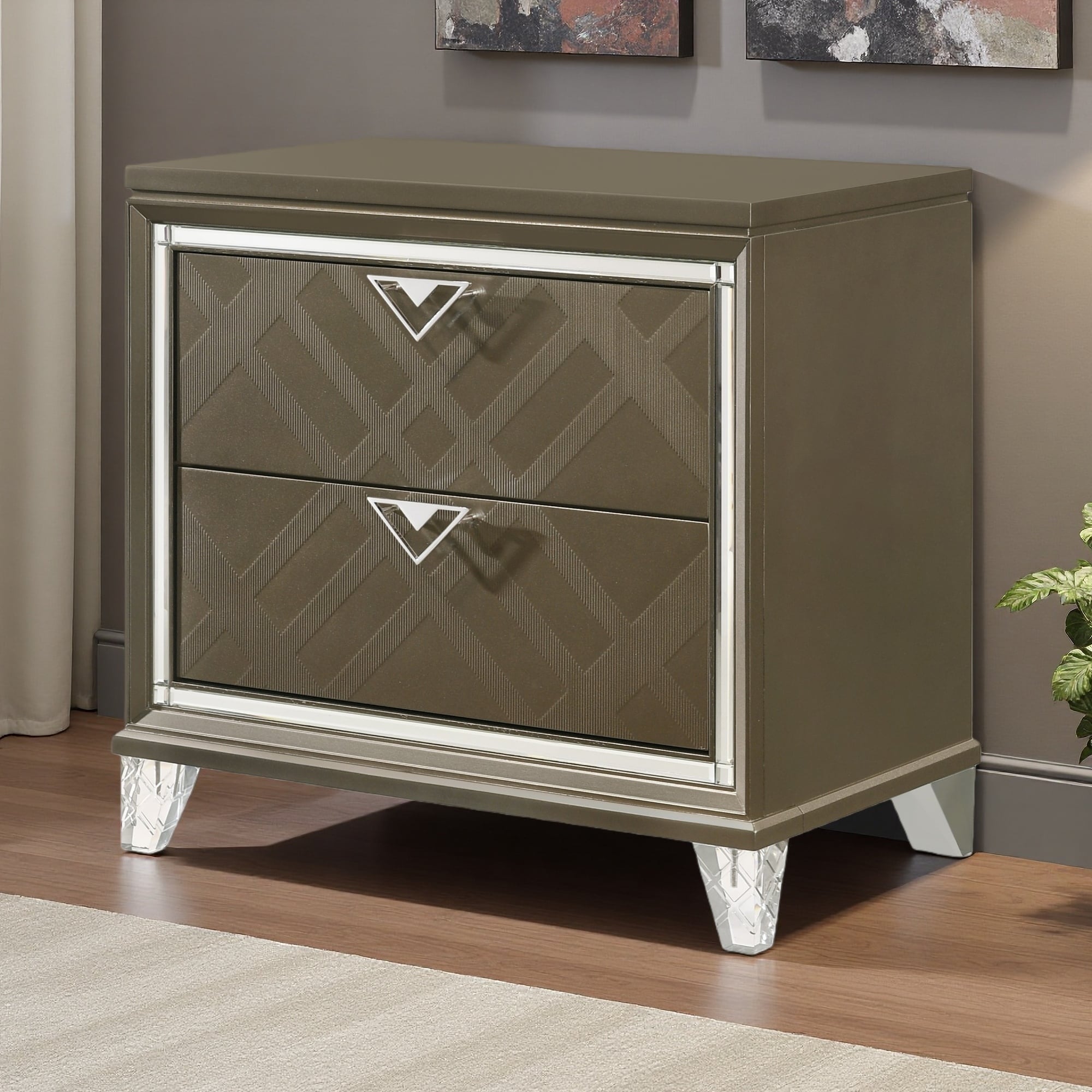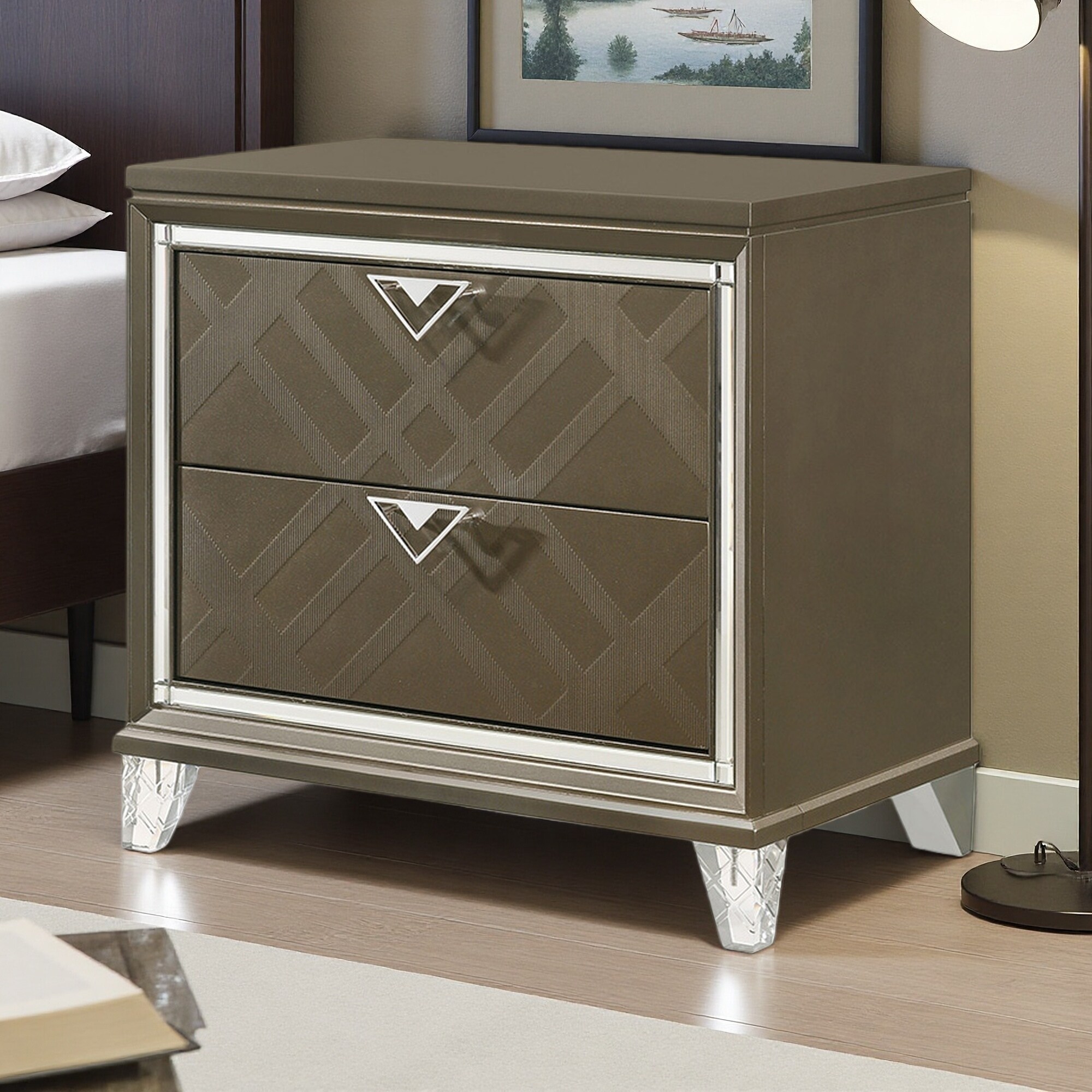 31"L Wooden Nightstand with 2 Drawers, Acrylic Legs, Beveled Mirrored Trim, Modern Glam Bedroom Furniture