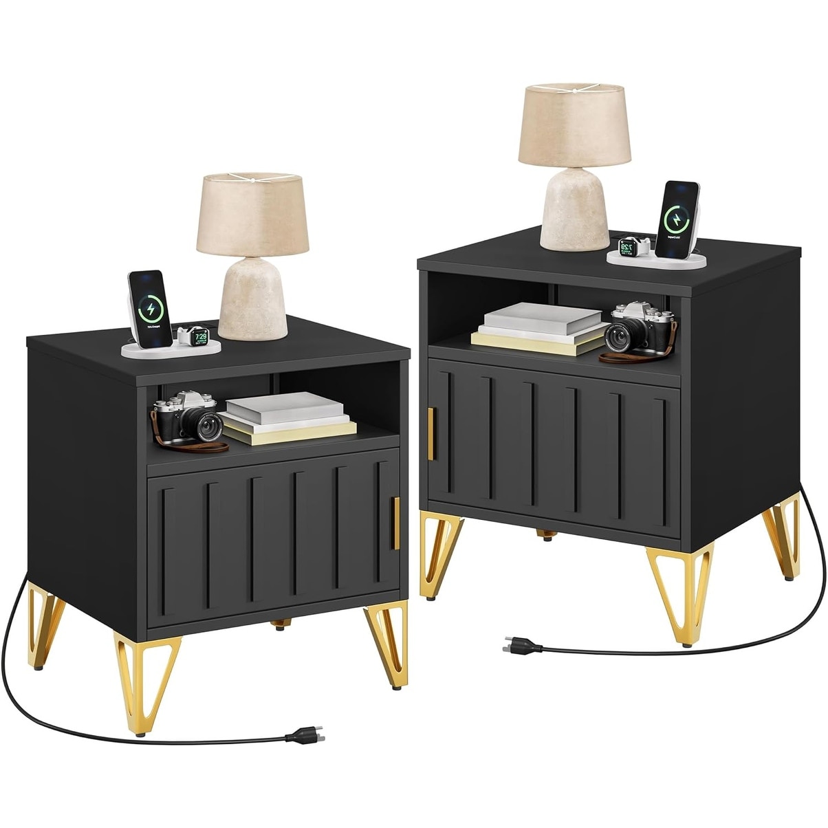 Modern Fluted Nightstand Set with Charging Station, USB Ports & AC Outlets, Metal Bedside Table with Storage Shelf for Bedroom