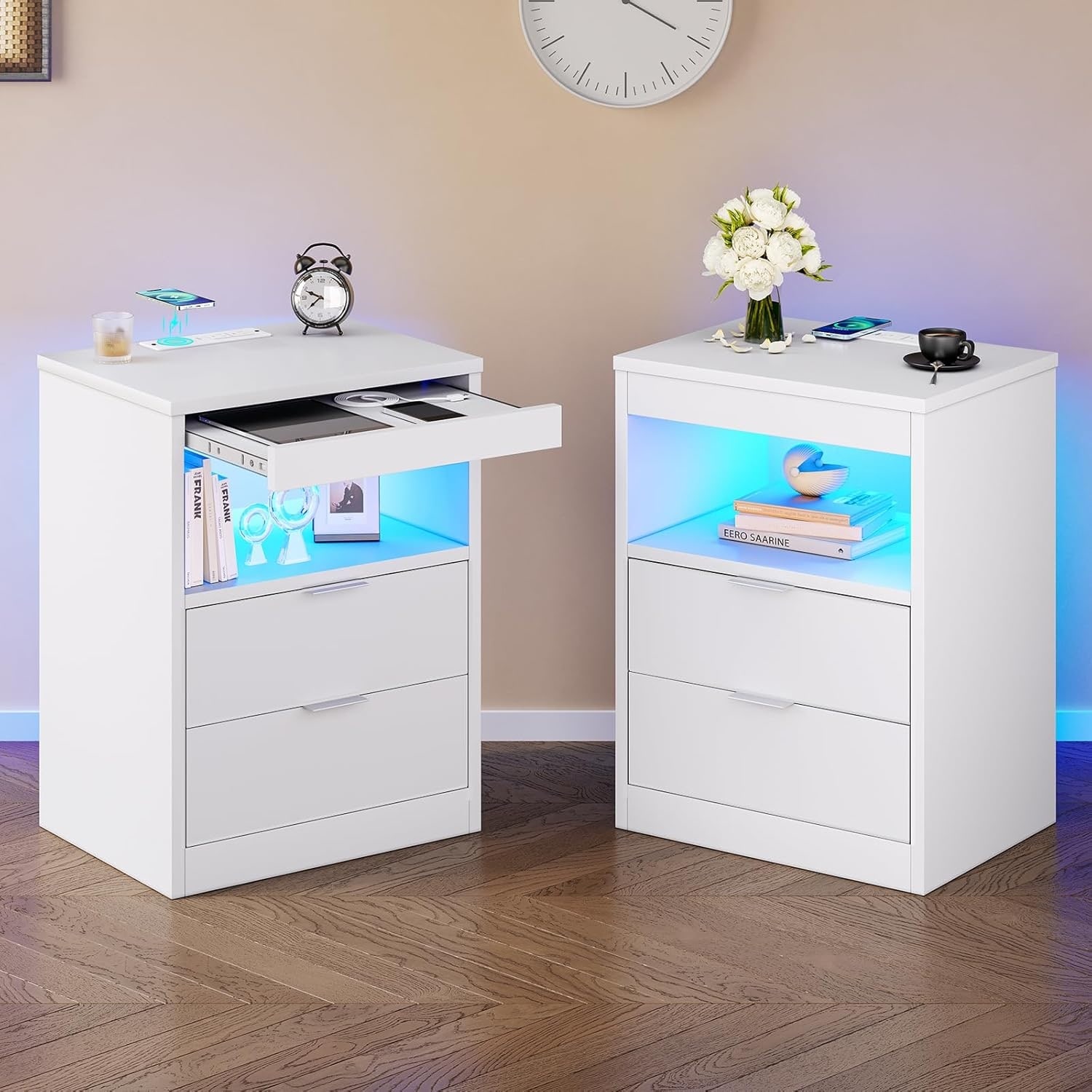 LED Nightstand Set of 2 with Wireless Charging, Drawers, and Pull-Out Shelf, Modern Bedside Table with Storage