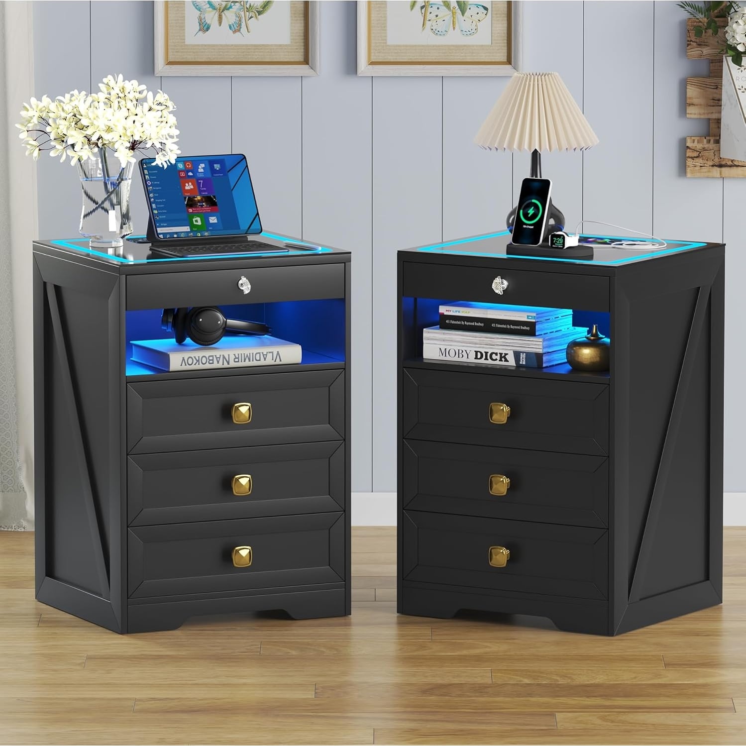 Modern LED Nightstand with 3 Drawers, Wireless Charging, Auto Sensor Light, Tempered Glass Top, Hidden Gun Safe Drawer