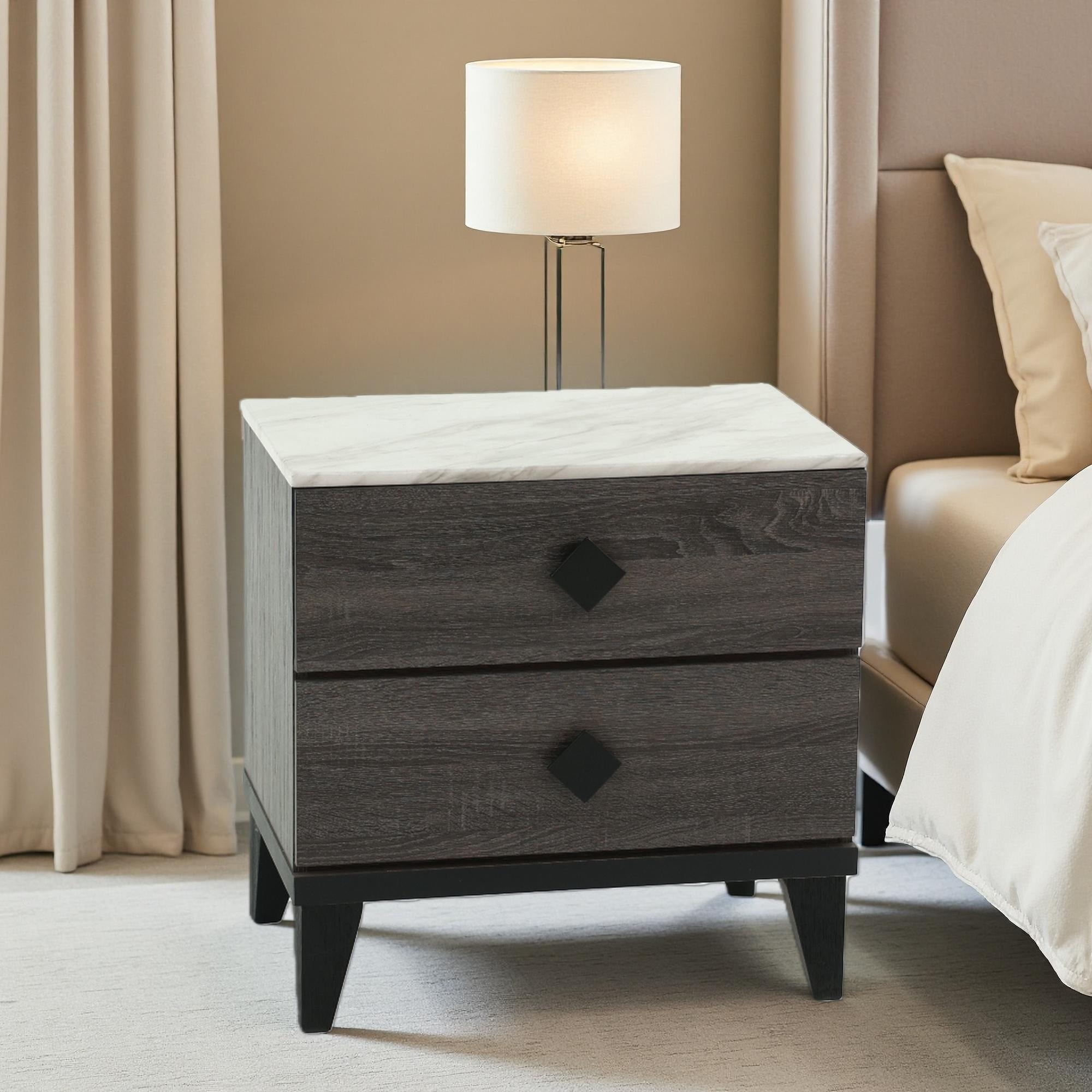23"L 2 Drawer Oak Nightstand with Faux Marble Top, Rustic Accents, Durable Wood Bedside Table, 23" H