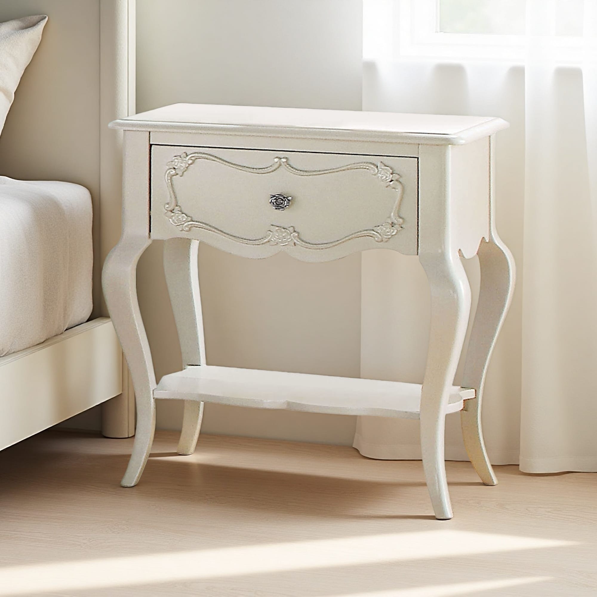 24"L Pine Wood 1-Drawer Nightstand with Open Shelf, Scalloped Apron, Rose Inlay & English Dovetail Construction