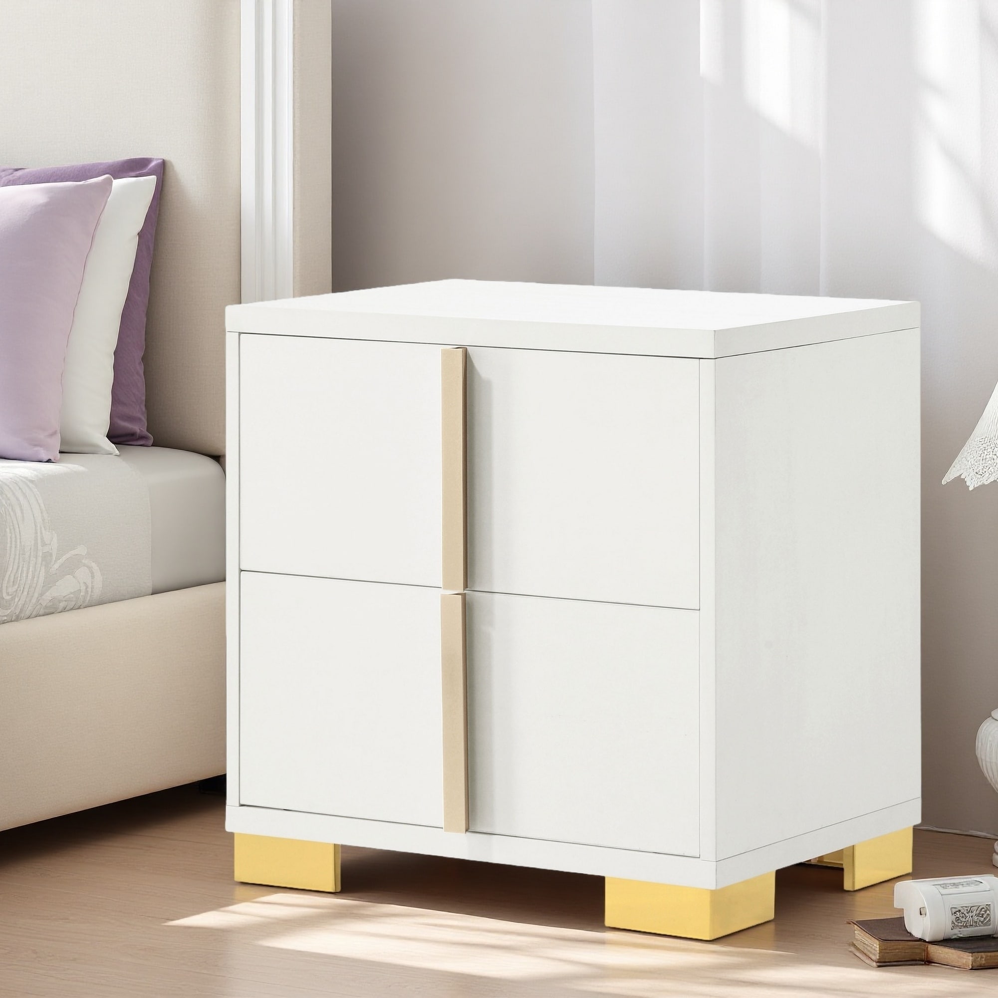White and Chrome 2-Drawer Nightstand with Stylish Legs for Modern Bedroom Decor