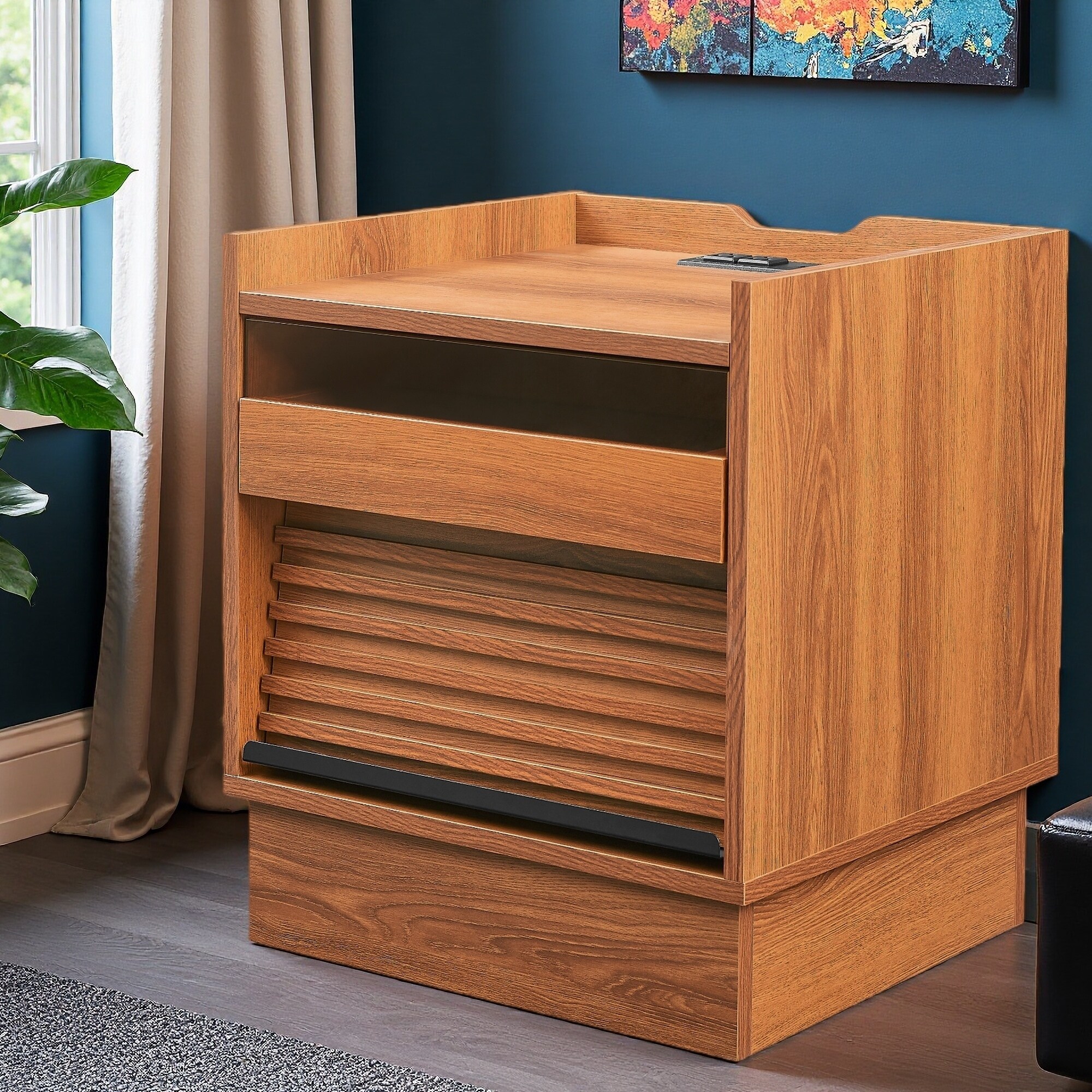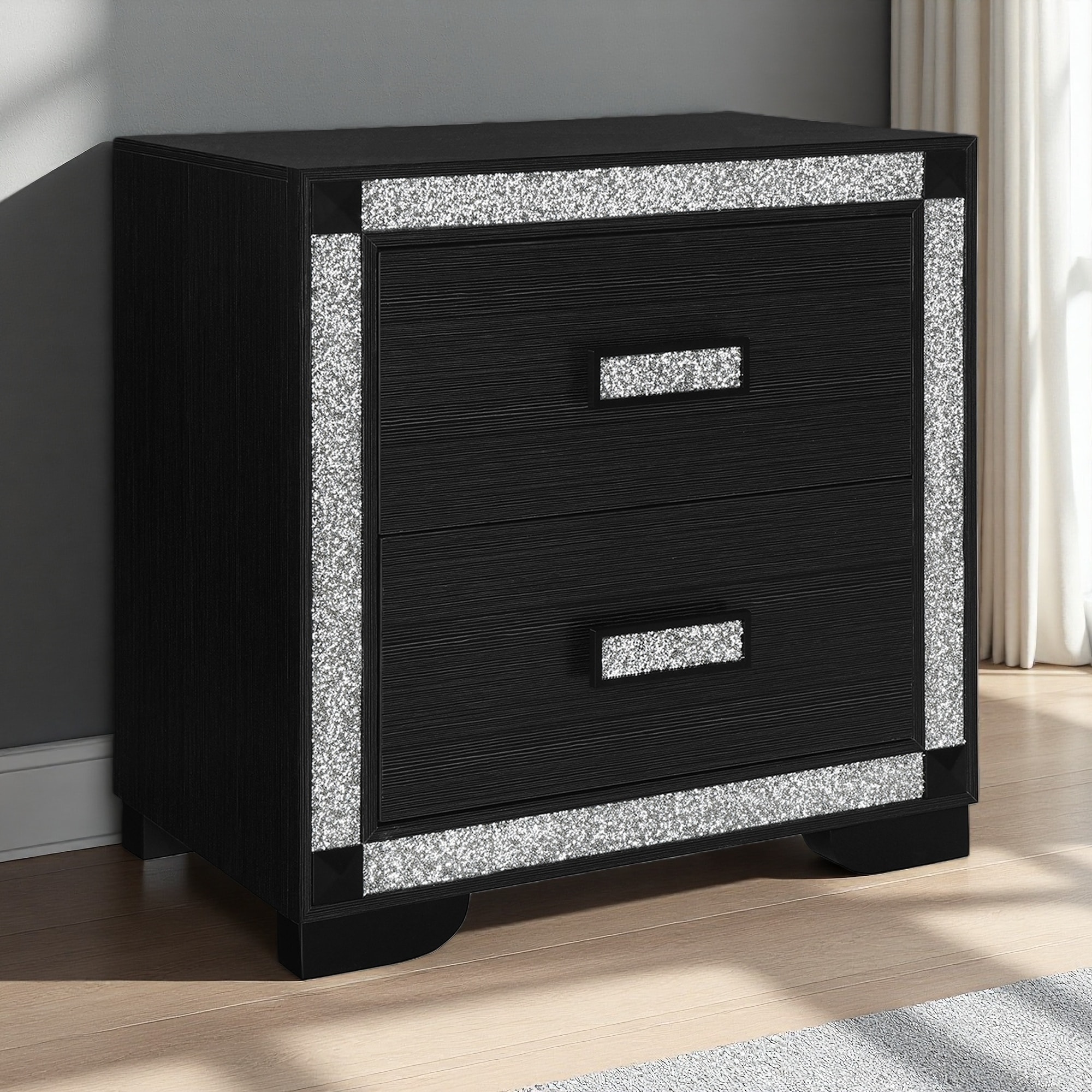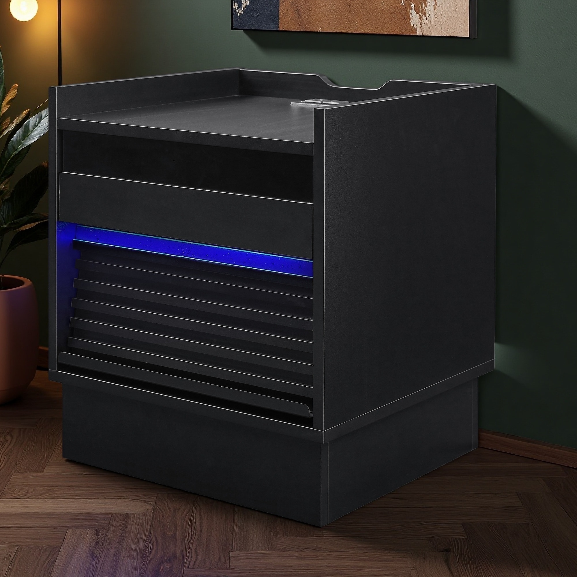 25.98"L Nightstand with Integrated Cooler, Speaker, Storage Shelves, Curved Legs, and Glitter Detailing