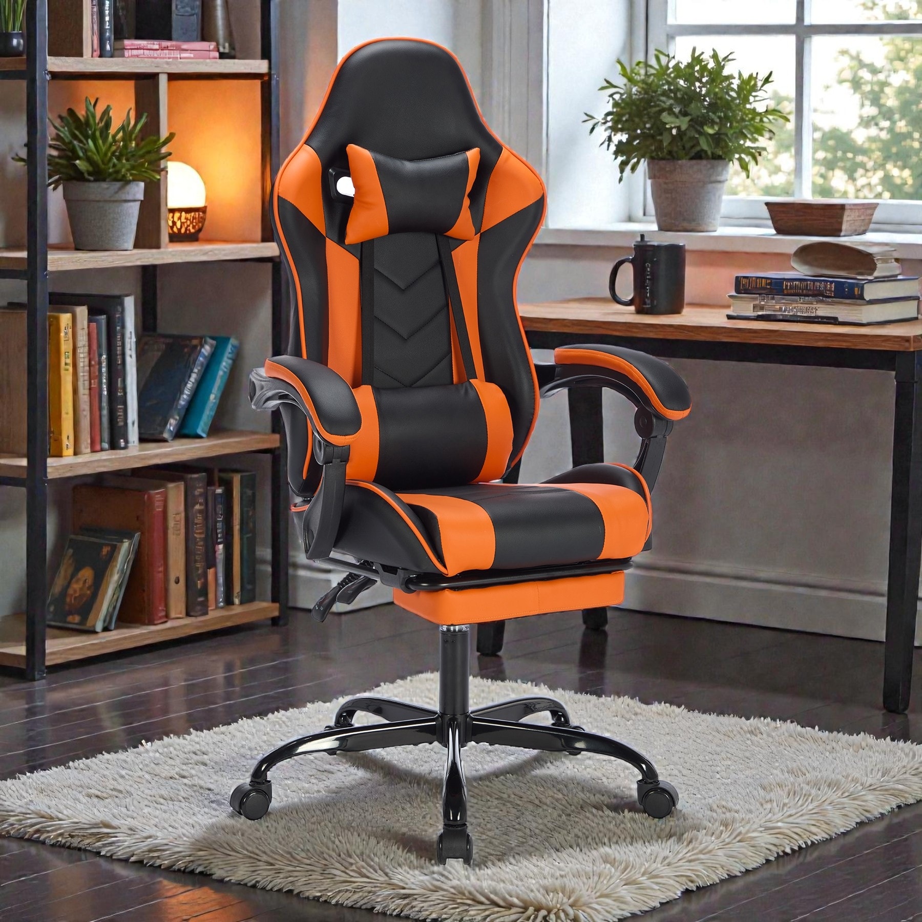 Ergonomic Gaming Chair with Footrest, Massage Lumbar Support, Adjustable Recline 90-135°, PU Leather High-Back Computer Chair