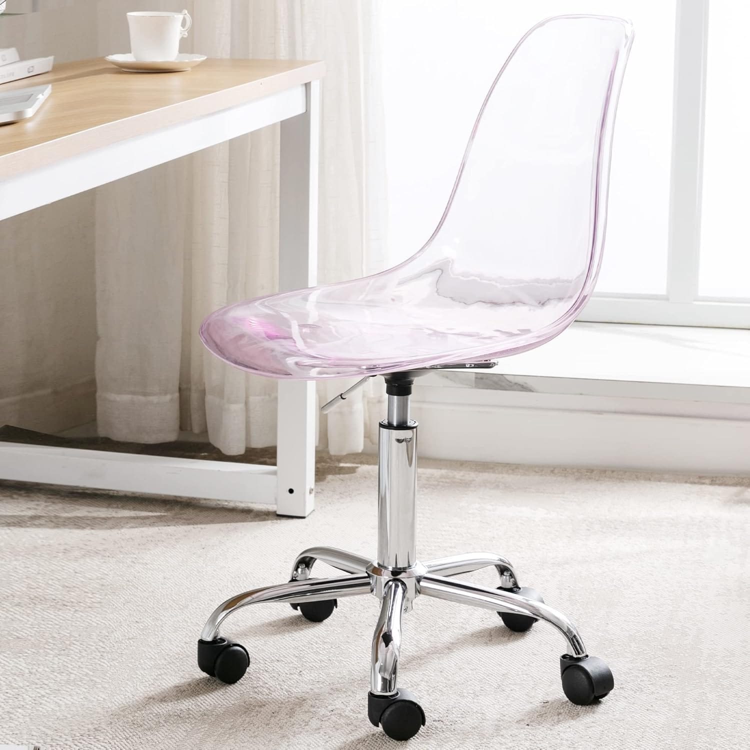 Clear Acrylic Swivel Rolling Office Chair, Height Adjustable Armless Vanity Chair with Wheels, Pink