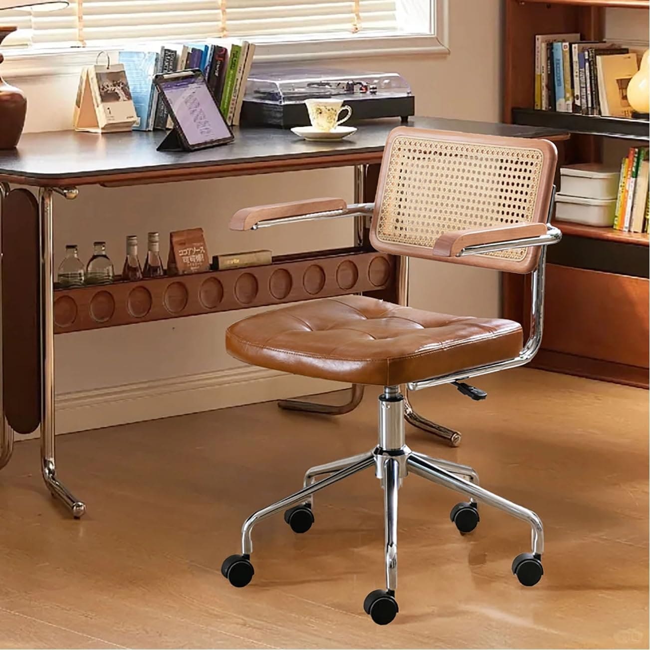 Modern Leather Desk Chair with Rattan Back, Adjustable Swivel Armchair for Home Office