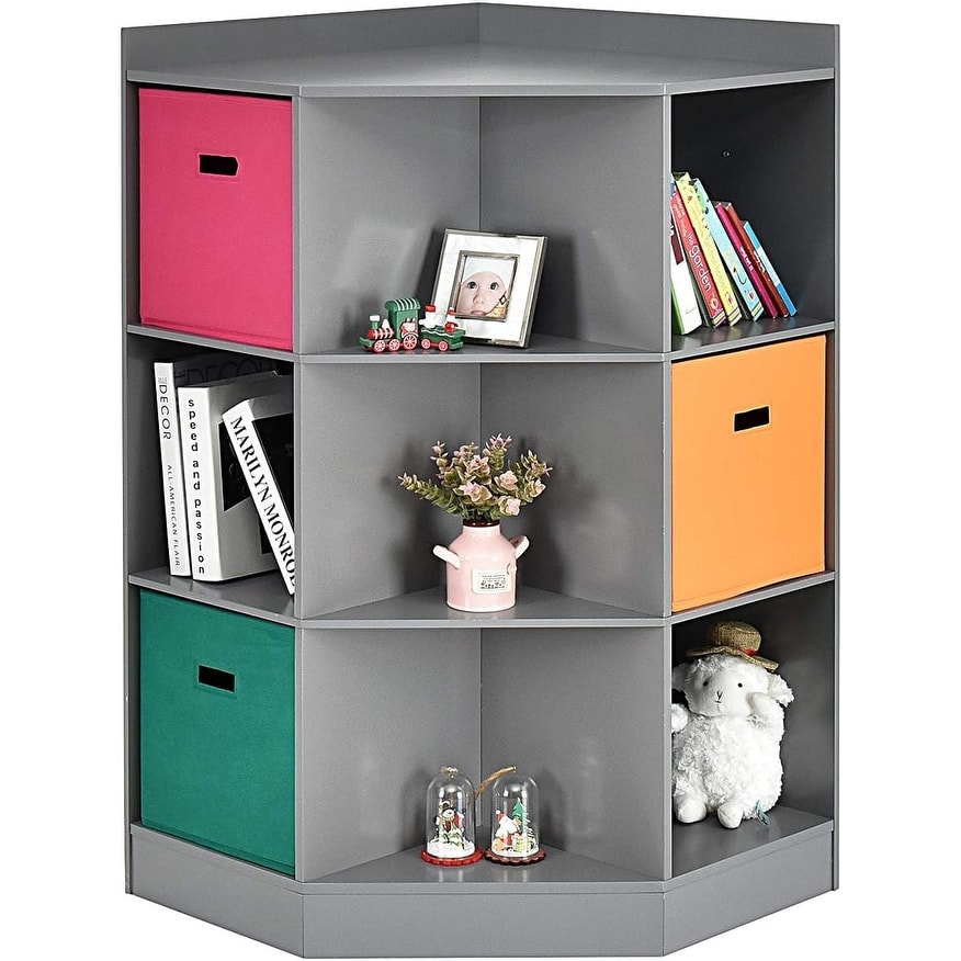 Corner Kids Bookcase with 6 Cubes & 3 Shelves, Wooden Storage Organizer for Playroom, Gray