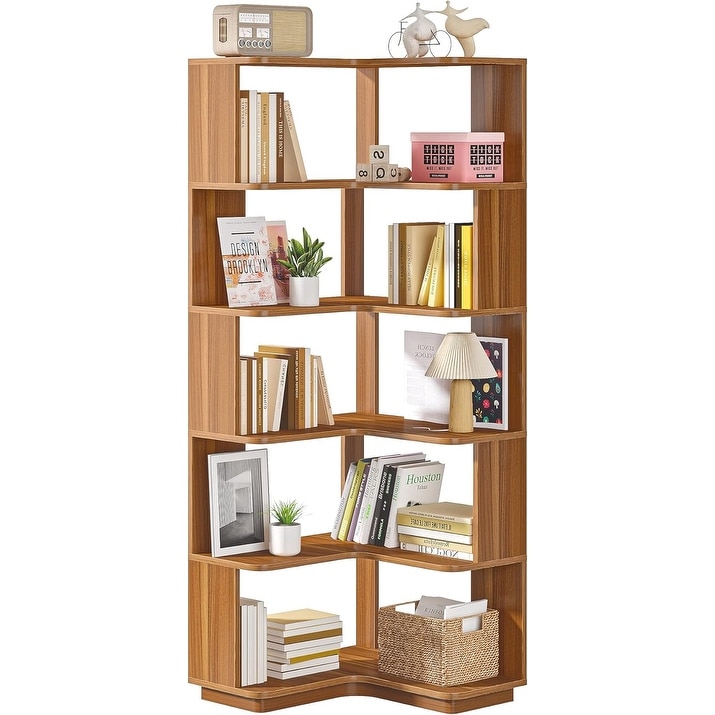 6-Shelf Corner Bookshelf, 65" Tall L-Shaped Bookcase, Industrial Storage Rack for Living Room, Walnut Wood Grain