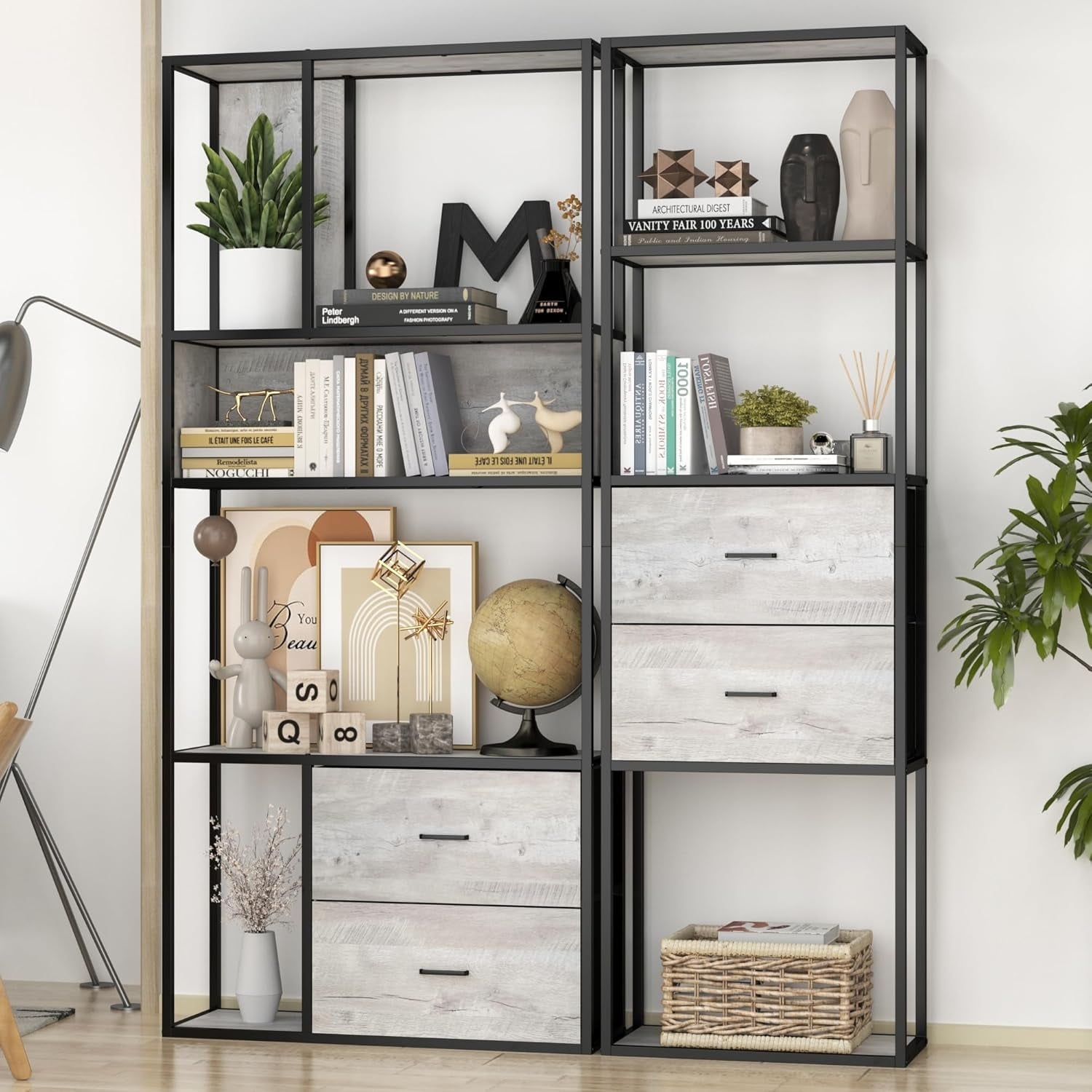 Rustic Industrial Tall Bookshelf with Drawers, Vintage Display Shelf for Home Office, Living Room