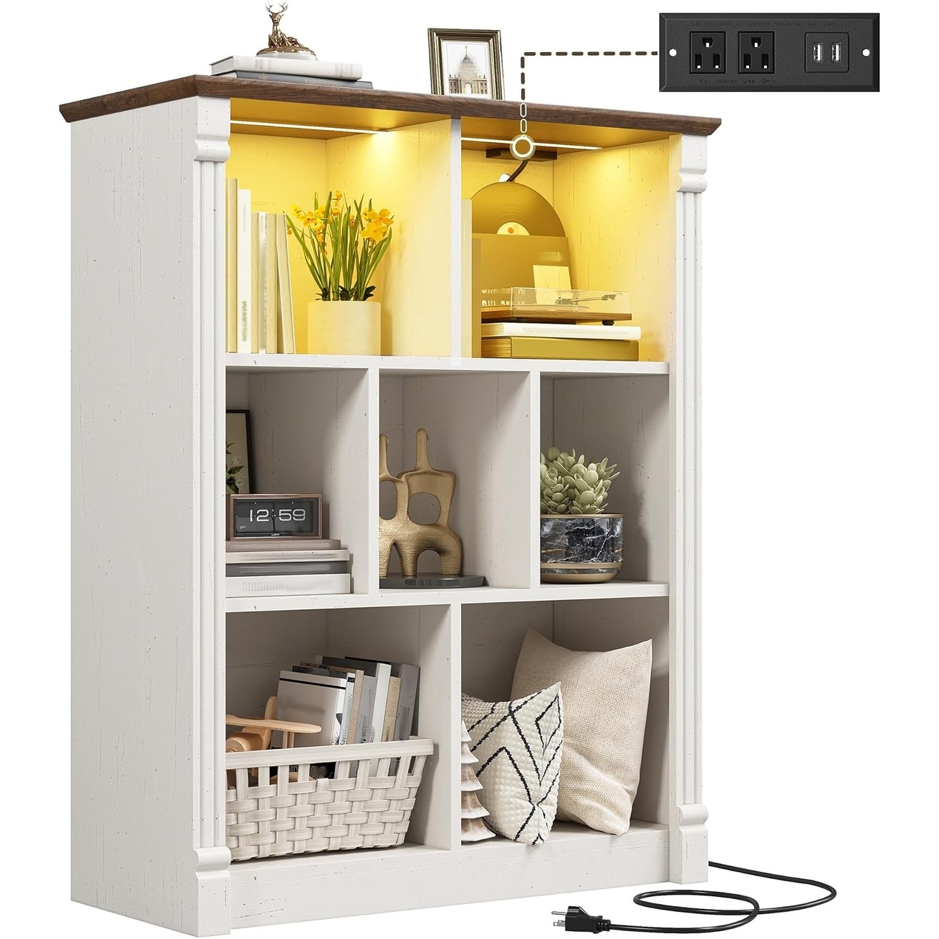 7-Cube Wood Storage Shelf with LED Lights & Charging Station, White Modern Bookshelf for Home Office