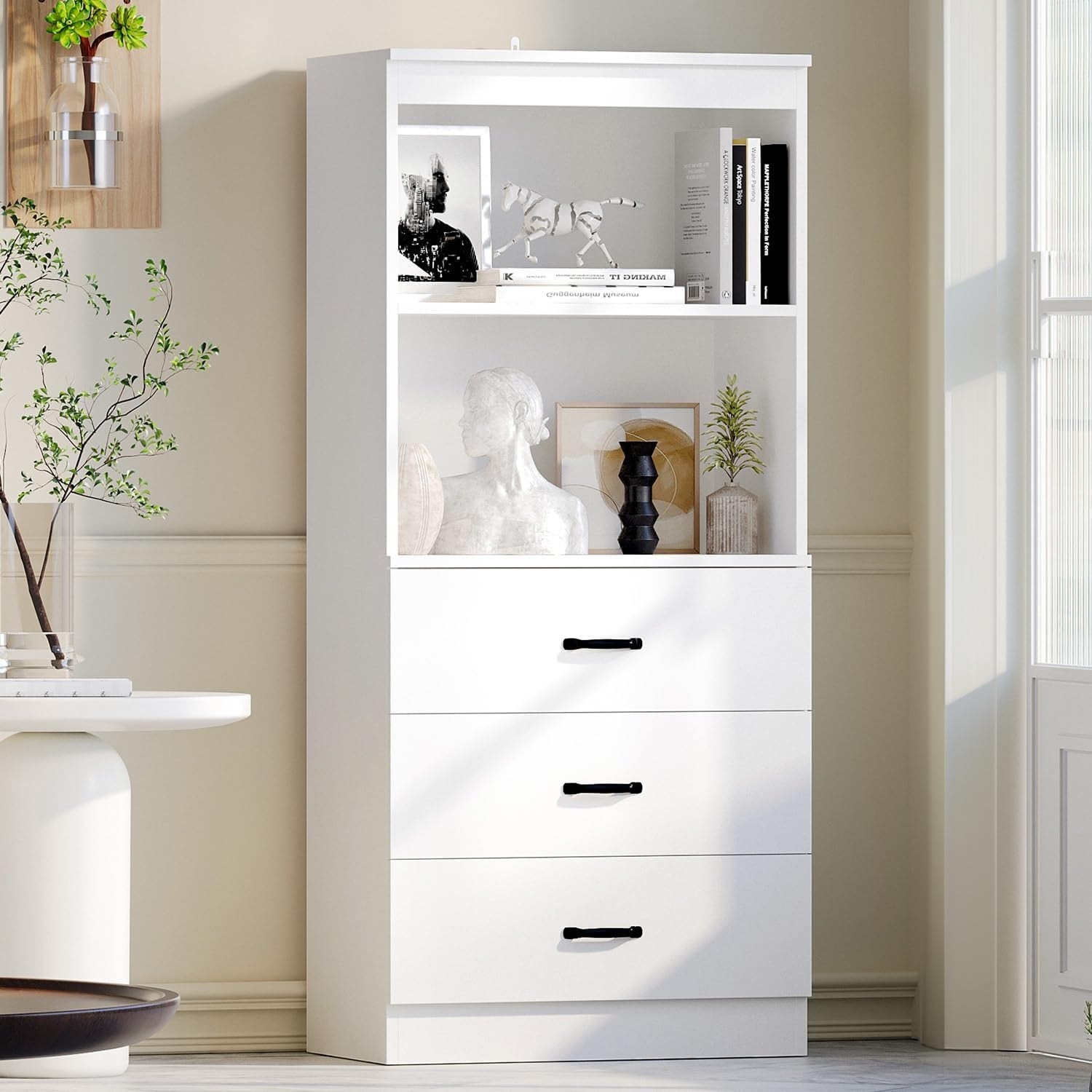 55.5 Inch White Wooden 5-Tier Bookshelf with 3 Drawers and 2 Open Shelves for Living Room, Bedroom, Office